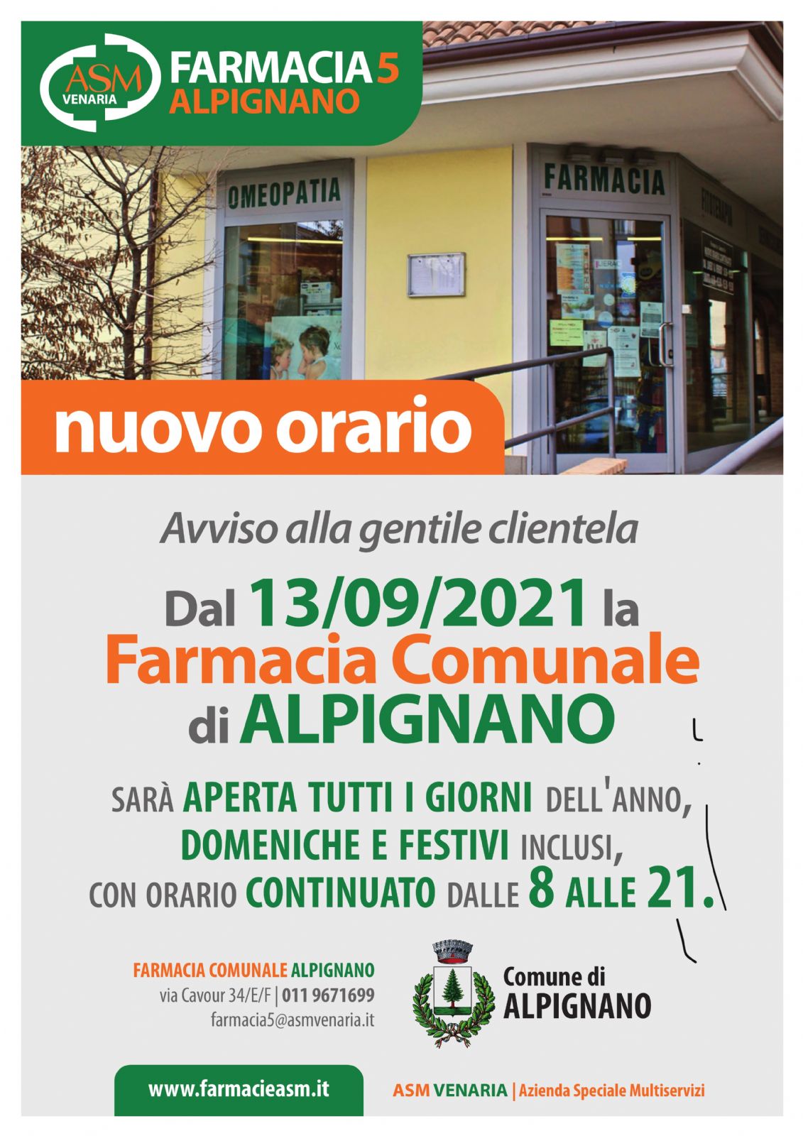 A seguito della convenzione firmata con il Comune di Alpignano, la Farmacia Comunale di Alpignano, sita in via Cavour n. 34, a partire da questa settimana, è aperta tutti i giorni, domeniche e festivi inclusi, con orario continuato dalle 8.00 alle 21.00.