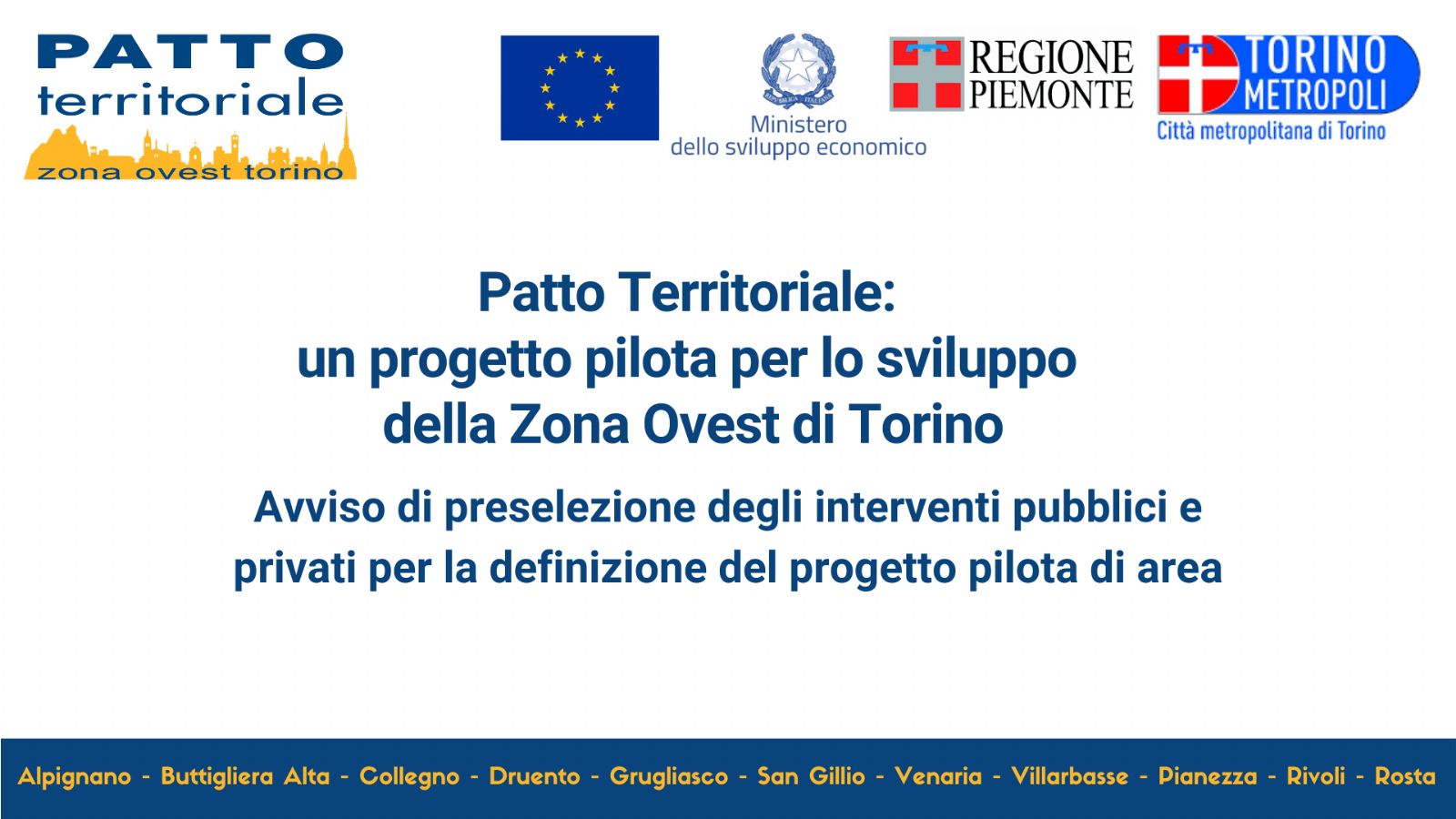 Pubblichiamo per conto del Patto Territoriale Zona Ovest di Torino per lo sviluppo della zona ovest di Torino, l'Avviso per la selezione degli interventi pubblici e privati che comporranno il progetto pilota per lo sviluppo della Zona Ovest di Torino, da candidare a valere sulle risorse messe a bando dal MiSE