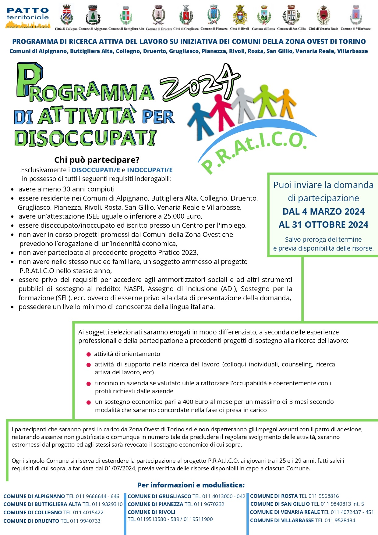 Si informa che dal 𝟏 𝐋𝐮𝐠𝐥𝐢𝐨 𝟐𝟎𝟐𝟒 non e' piu' possibile presentare la propria candidatura per il 𝐩𝐫𝐨𝐠𝐞𝐭𝐭𝐨 𝐏.𝐑.𝐀.𝐭.𝐈.𝐂.𝐎. - programma di attivita' per disoccupati- in collaborazione con il 𝐏𝐚𝐭𝐭𝐨 𝐓𝐞𝐫𝐫𝐢𝐭𝐨𝐫𝐢𝐚𝐥𝐞 𝐙𝐨𝐧𝐚 𝐎𝐯𝐞𝐬𝐭, dato che il Comune ha 𝐞𝐬𝐚𝐮𝐫𝐢𝐭𝐨 𝐢 𝐩𝐨𝐬𝐭𝐢 𝐚 𝐩𝐫𝐨𝐩𝐫𝐢𝐚 𝐝𝐢𝐬𝐩𝐨𝐬𝐢𝐳𝐢𝐨𝐧𝐞.