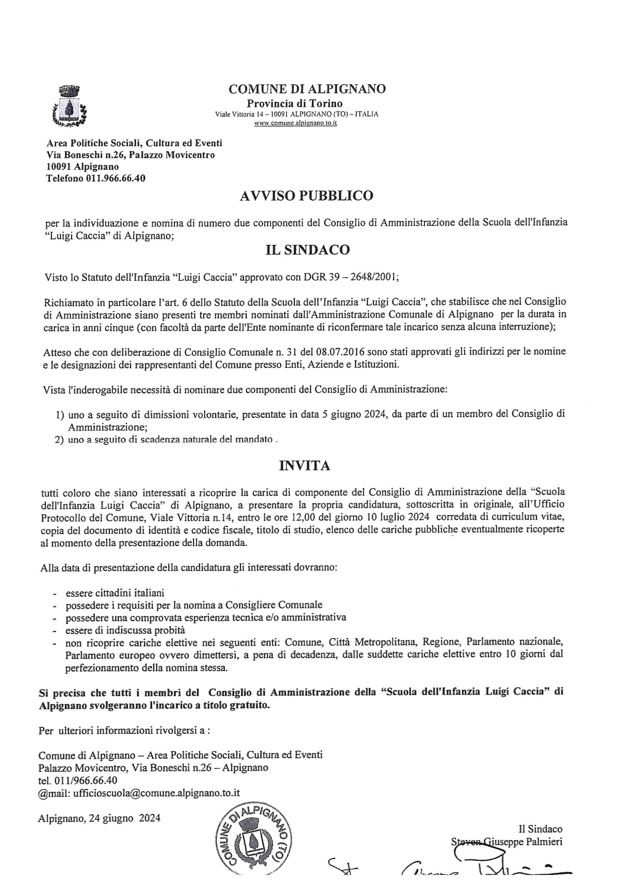 Avviso pubblico per l'individuazione e nomina di numero 𝐝𝐮𝐞 𝐜𝐨𝐦𝐩𝐨𝐧𝐞𝐧𝐭𝐢 𝐝𝐞𝐥 𝐂𝐨𝐧𝐬𝐢𝐠𝐥𝐢𝐨 𝐝𝐢 𝐀𝐦𝐦𝐢𝐧𝐢𝐬𝐭𝐫𝐚𝐳𝐢𝐨𝐧𝐞 𝐝𝐞𝐥𝐥𝐚 𝐒𝐜𝐮𝐨𝐥𝐚 𝐝𝐞𝐥𝐥'𝐈𝐧𝐟𝐚𝐧𝐳𝐢𝐚 “𝐋𝐮𝐢𝐠𝐢 𝐂𝐚𝐜𝐜𝐢𝐚” 𝐝𝐢 𝐀𝐥𝐩𝐢𝐠𝐧𝐚𝐧𝐨.