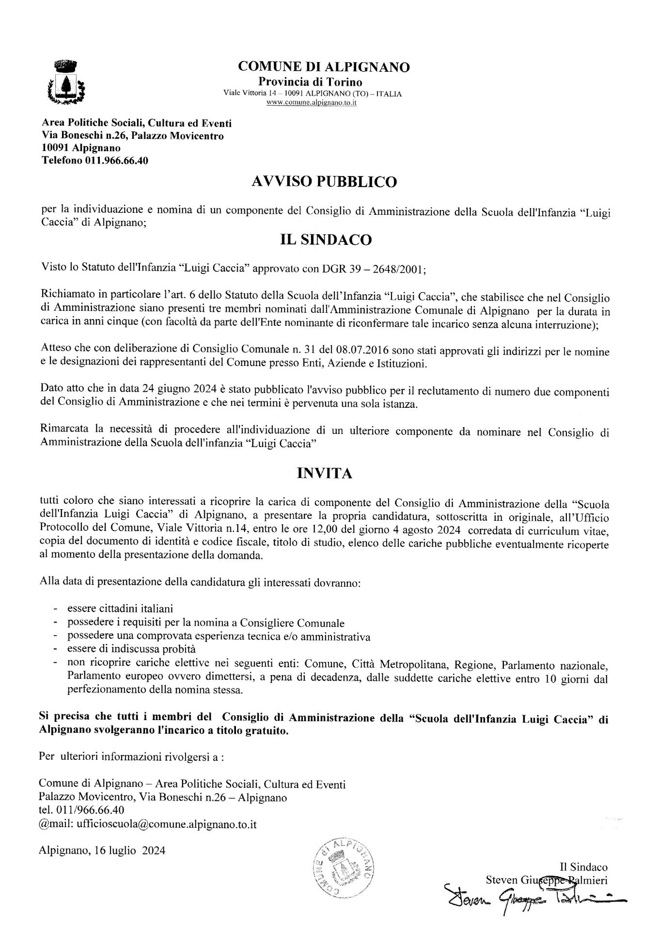Avviso pubblico per l' 𝐢𝐧𝐝𝐢𝐯𝐢𝐝𝐮𝐚𝐳𝐢𝐨𝐧𝐞 𝐞 𝐧𝐨𝐦𝐢𝐧𝐚 𝐝𝐢 𝐧𝐮𝐦𝐞𝐫𝐨 𝐮𝐧 𝐜𝐨𝐦𝐩𝐨𝐧𝐞𝐧𝐭𝐞 del 𝐂𝐨𝐧𝐬𝐢𝐠𝐥𝐢𝐨 𝐝𝐢 𝐀𝐦𝐦𝐢𝐧𝐢𝐬𝐭𝐫𝐚𝐳𝐢𝐨𝐧𝐞 𝐝𝐞𝐥𝐥𝐚 𝐒𝐜𝐮𝐨𝐥𝐚 𝐝𝐞𝐥𝐥'𝐈𝐧𝐟𝐚𝐧𝐳𝐢𝐚 “𝐋𝐮𝐢𝐠𝐢 𝐂𝐚𝐜𝐜𝐢𝐚” 𝐝𝐢 𝐀𝐥𝐩𝐢𝐠𝐧𝐚𝐧𝐨.