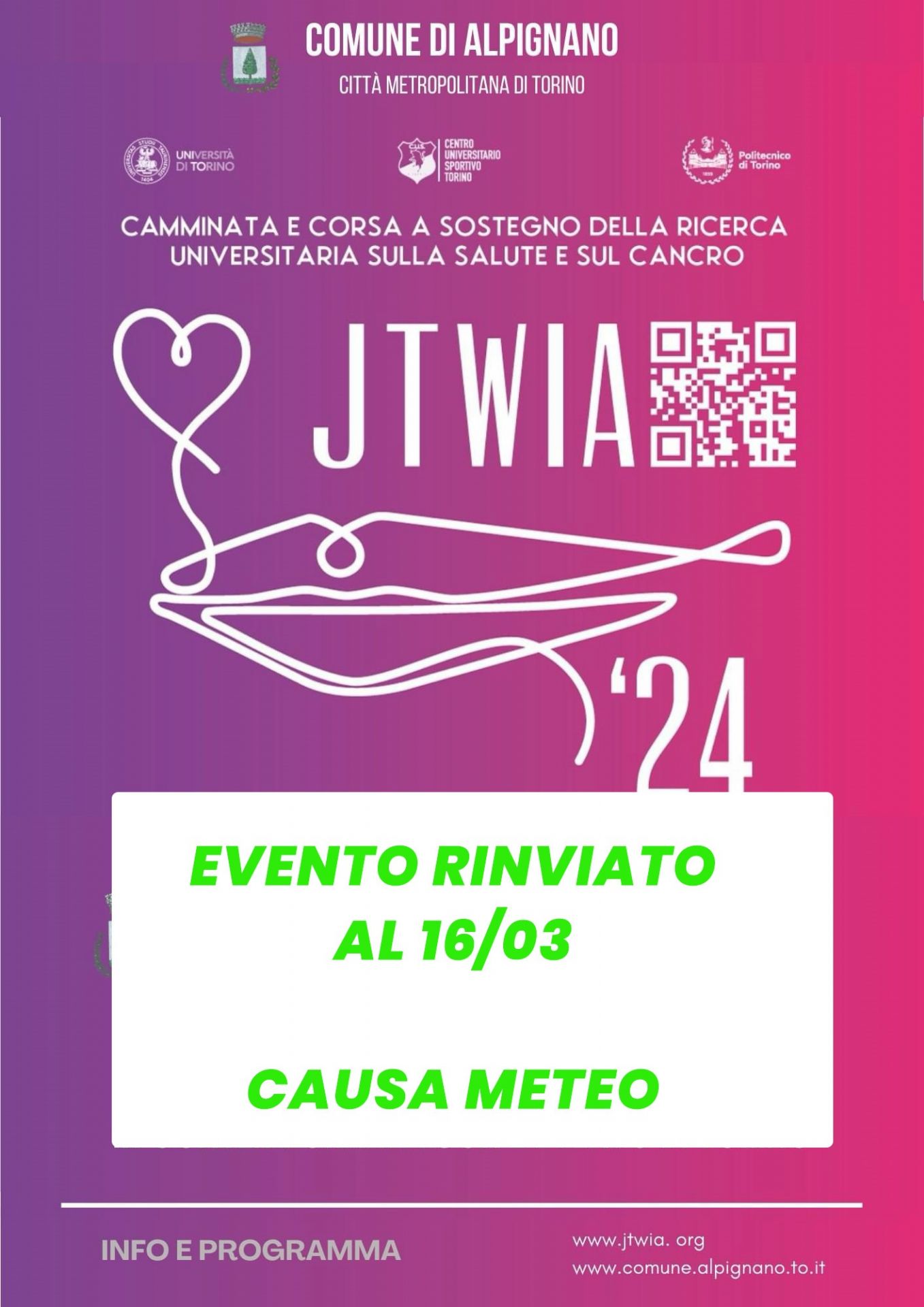 A causa delle avversità climatiche, si comunica che l'𝐢𝐧𝐚𝐮𝐠𝐮𝐫𝐚𝐳𝐢𝐨𝐧𝐞 𝐝𝐞𝐥 𝐩𝐞𝐫𝐜𝐨𝐫𝐬𝐨 𝐫𝐨𝐬𝐚 𝐞 𝐥𝐚 𝐜𝐚𝐦𝐦𝐢𝐧𝐚𝐭𝐚 𝐉𝐓𝐖𝐈𝐀 𝐢𝐧 𝐩𝐫𝐨𝐠𝐫𝐚𝐦𝐦𝐚 𝐝𝐨𝐦𝐞𝐧𝐢𝐜𝐚 𝟑 𝐦𝐚𝐫𝐳𝐨 𝐧𝐨𝐧 𝐚𝐯𝐫𝐚̀ 𝐥𝐮𝐨𝐠𝐨.