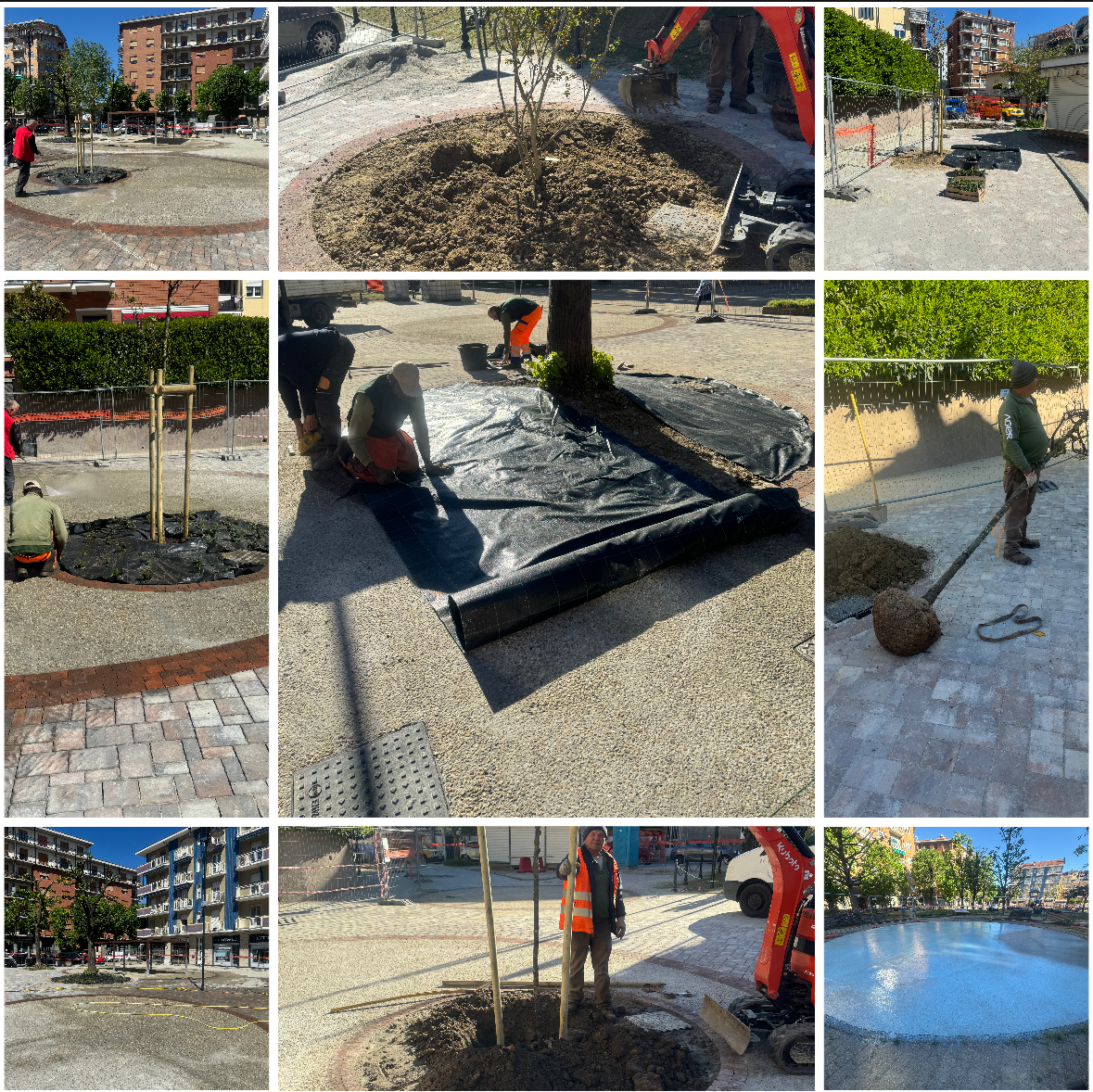 Oggi sono in corso le operazioni di getto del cemento lavato di rifinitura nell'isola centrale e la piantumazione degli alberi a fusto e delle tappezzanti sempreverde.