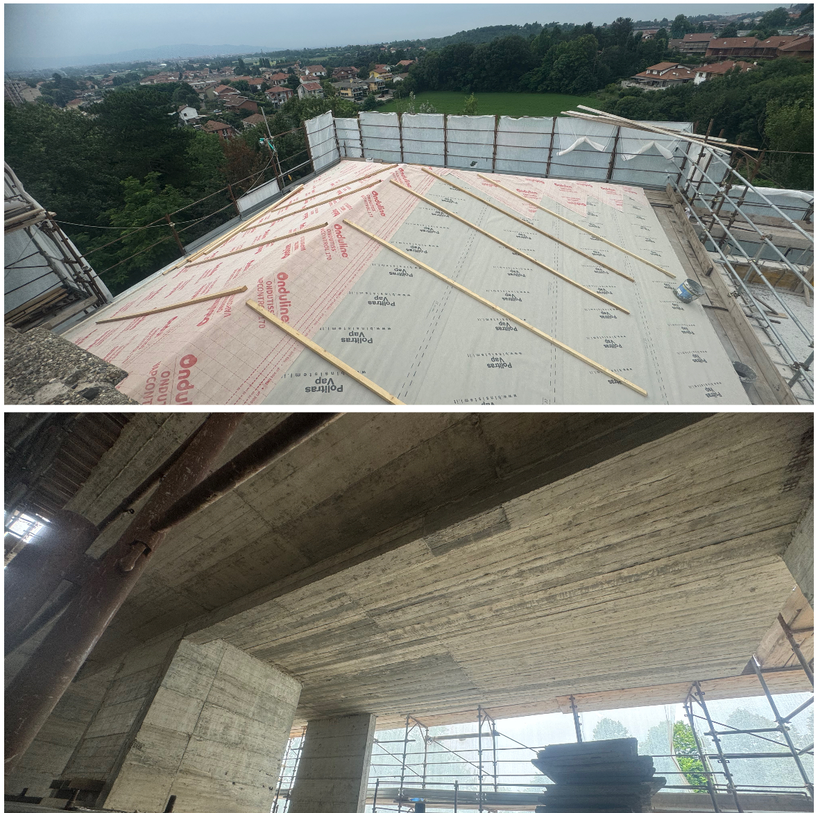 Oggi sono in corso i lavori di completamento posa telo sottotetto freno del vapore falde della copertura lato sinistro della villa storica. Viene impiegato come freno al vapore su assito continuo per il rilascio graduale dell'umidità.