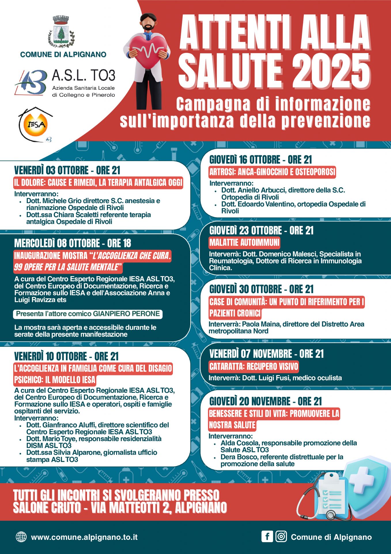 Otto appuntamenti informativi gratuiti, dal 3 ottobre al 20 novembre, dedicati alla salute e al benessere in collaborazione con l’ASL TO3 e del Centro Esperto Regionale IESA.