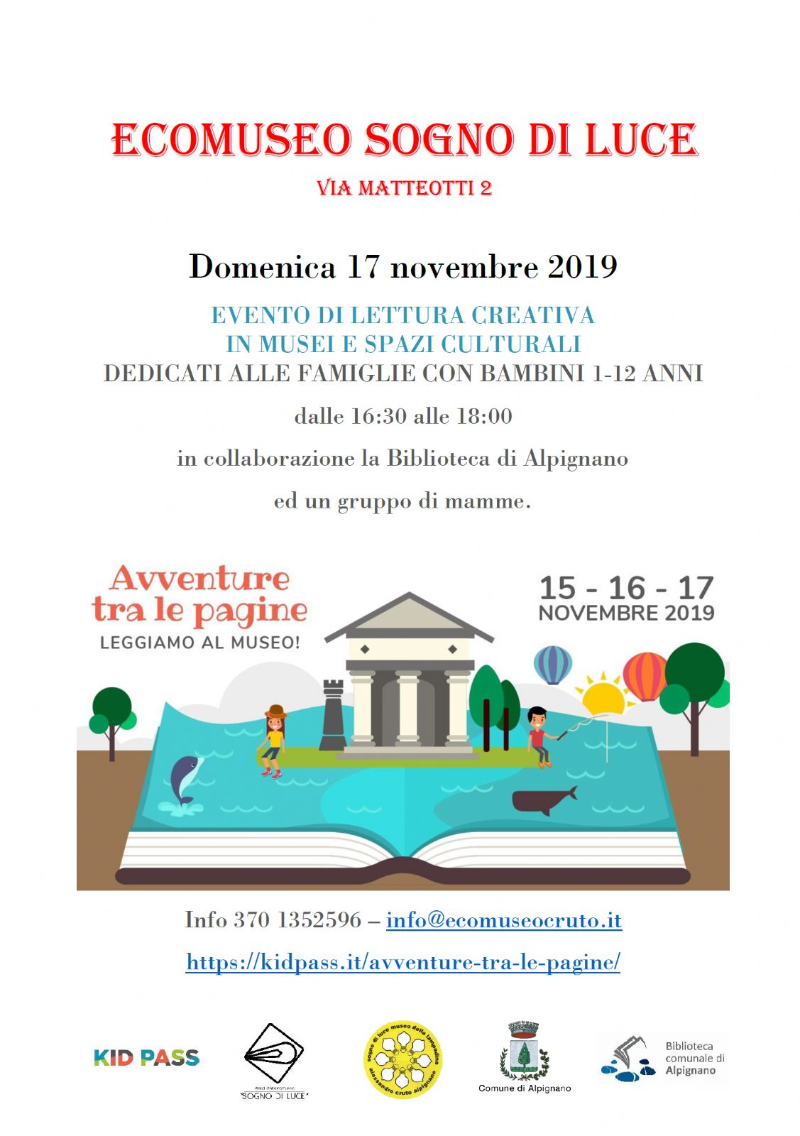 In collaborazione con la Biblioteca di Alpignano e con un gruppo di mamme abbiamo aderito all'iniziativa "avventure tra le pagine" di KID PASS, associazione specializzata in organizzazione e comunicazione di grandi eventi e attività per famiglie che amano la cultura.
