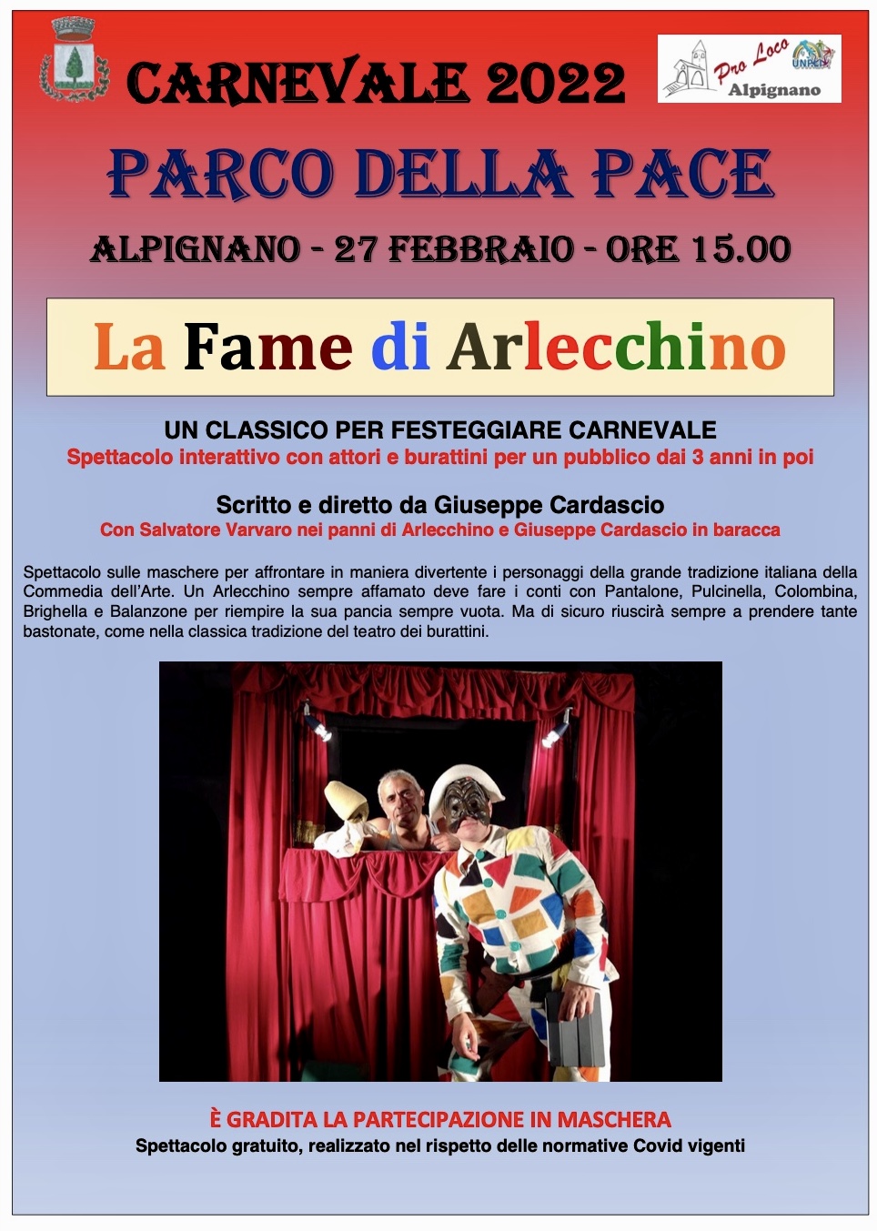 La Pro Loco di Alpignano con il patrocinio del Comune, organizza uno spettacolo interattivo con attori e burattini "La fame di Arlecchino".