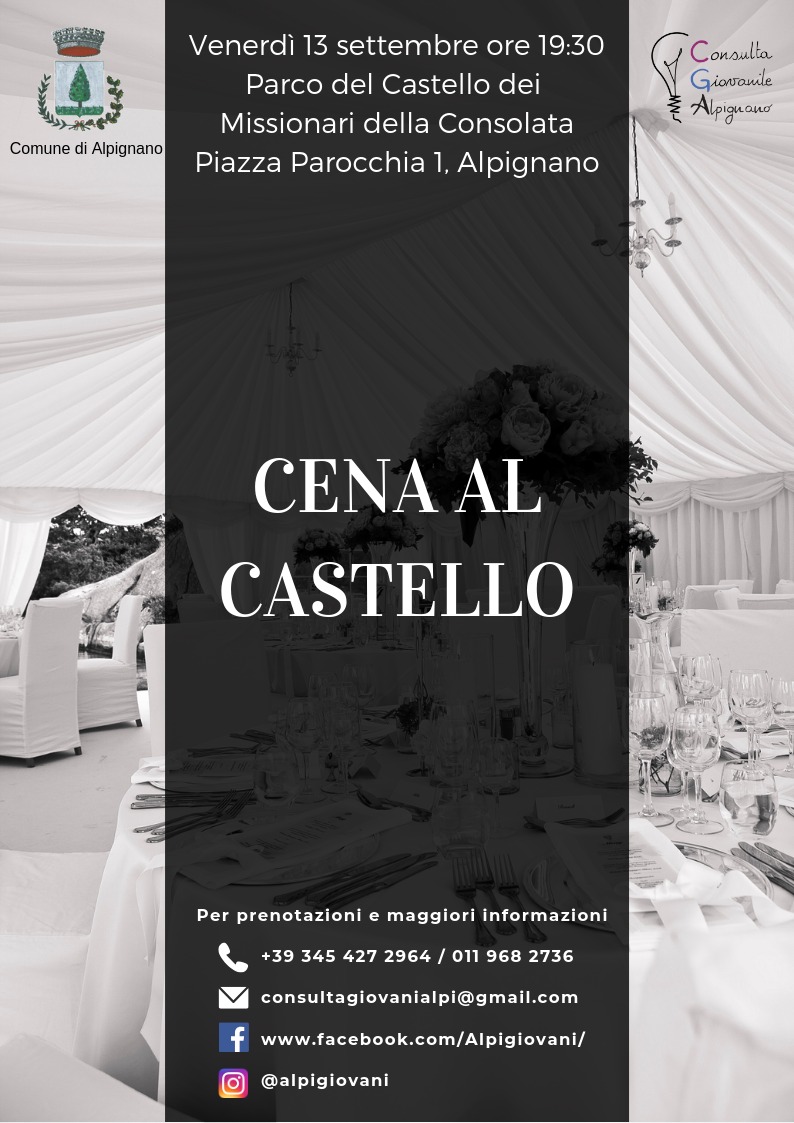La Consulta Giovanile Alpignano organizza una "Cena al Castello" al Parco del Castello dei Missionari della Consolata, venerdì 13 settembre alle ore 19.30.