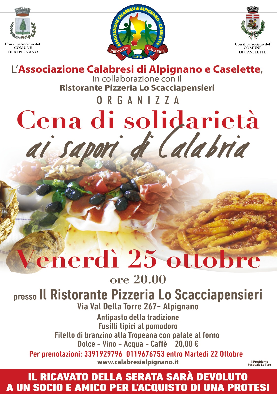L'Associazione Calabresi di Alpignano e Caselette organizza venerdì 25 ottobre una cena di solidarietà il cui ricavato sarà devoluto per l'acquisto di una protesi.