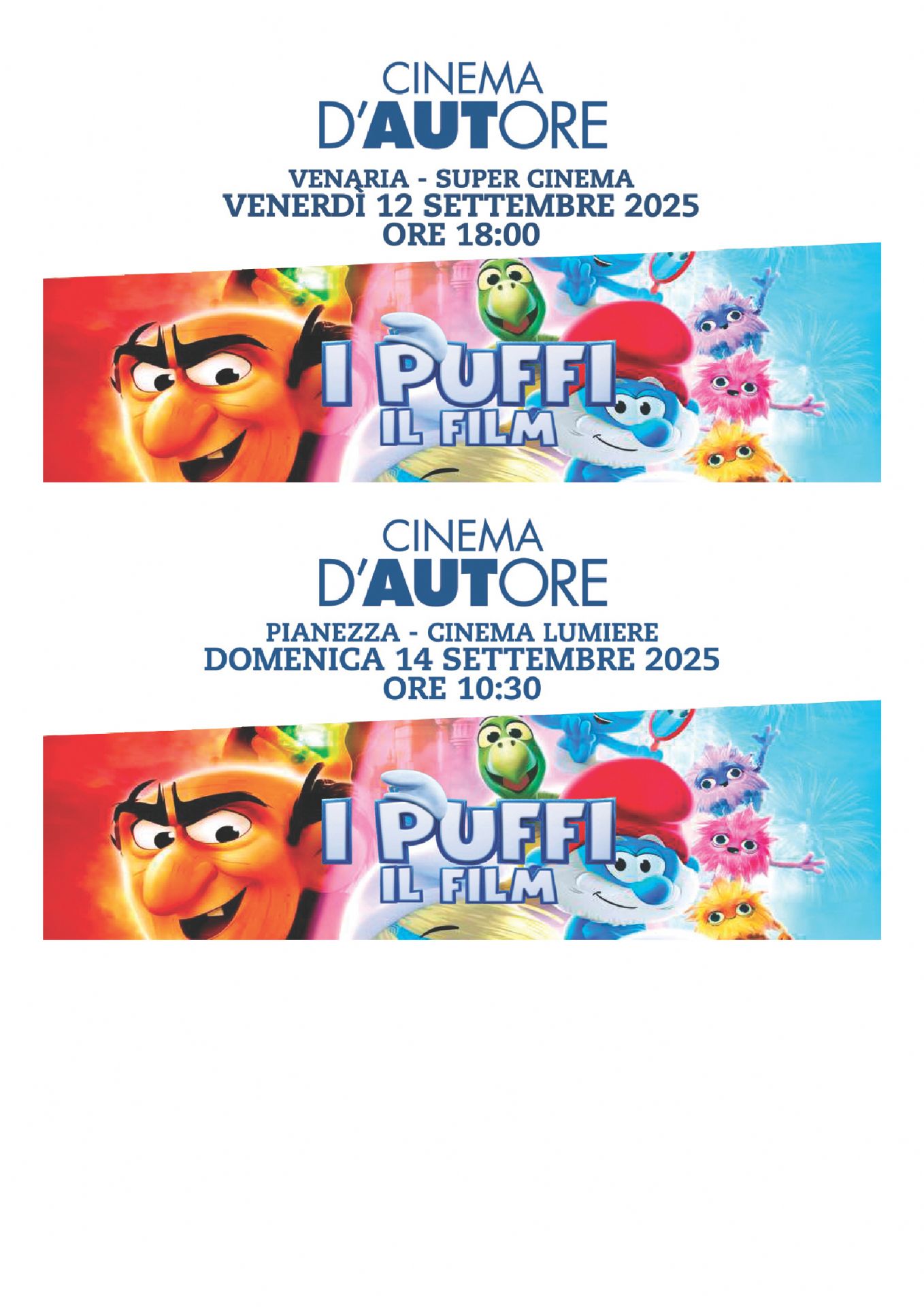 - Domenica 14 settembre 2025 ore 10.30 “I Puffi” presso il cinema Lumiere di Pianezza Via Fratelli Rosselli n. 19 (prenotazione entro il 09/09/2025)