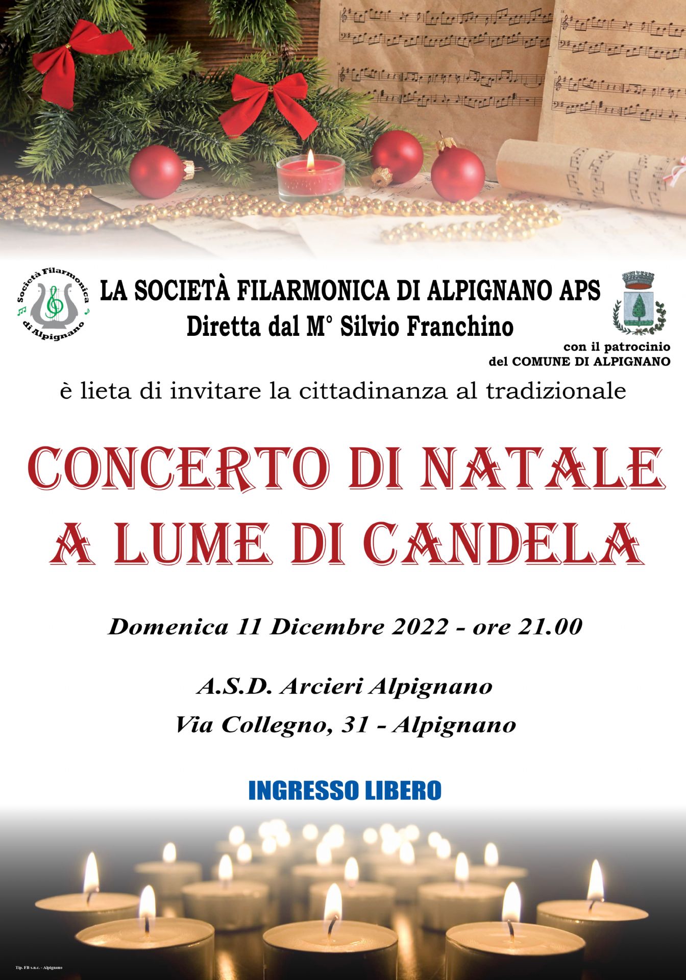 La Società Filarmonica di Alpignano APS, diretta dal Maestro Silvio Franchino, organizza il tradizionale Concerto di Natale a lume di candela domenica 11 dicembre alle 21 presso la sede degli Arcieri Alpignano, via Collegno 31.