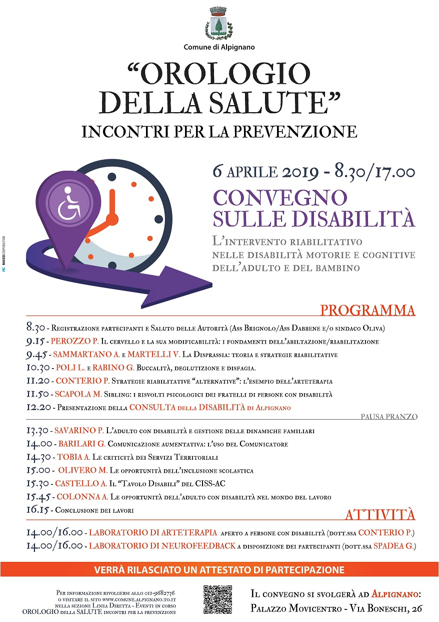 Nell'ambito dell'iniziativa "Orologio della salute" incontri per la prevenzione, vi segnaliamo il Convegno sulle disabilità: l'intervento riabilitativo nelle disabilità motorie e cognitive dell'adulto e del bambino, sabato 6 aprile presso il Palazzo Movicentro, via Boneschi 26, Alpignano.