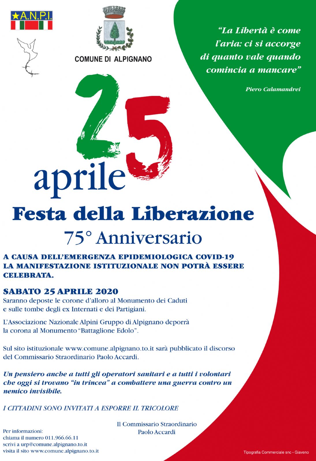 A causa dell'emergenza epidemiologica la manifestazione non potrà essere svolta ma Alpignano celebrerà comunque in forma "virtuale" il 75° anniversario della Liberazione condividendo con i cittadini il ricordo di questa importante ricorrenza.