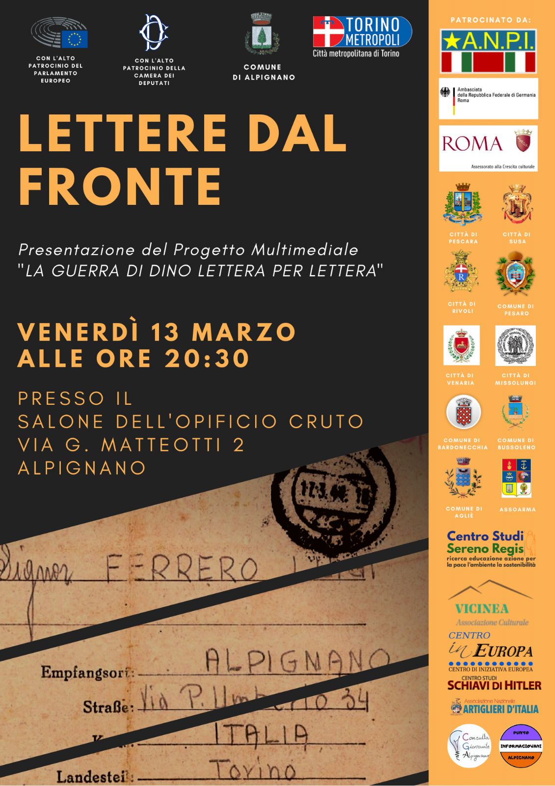 L'Associazione ANPI Sezione Intercomunale di Alpignano Vi invita a partecipare alla presentazione del Progetto Multimediale "La guerra di Dino lettera per lettera" venerdì 13 marzo, alle ore 20:30 presso il Salone Cruto via Matteotti 2.