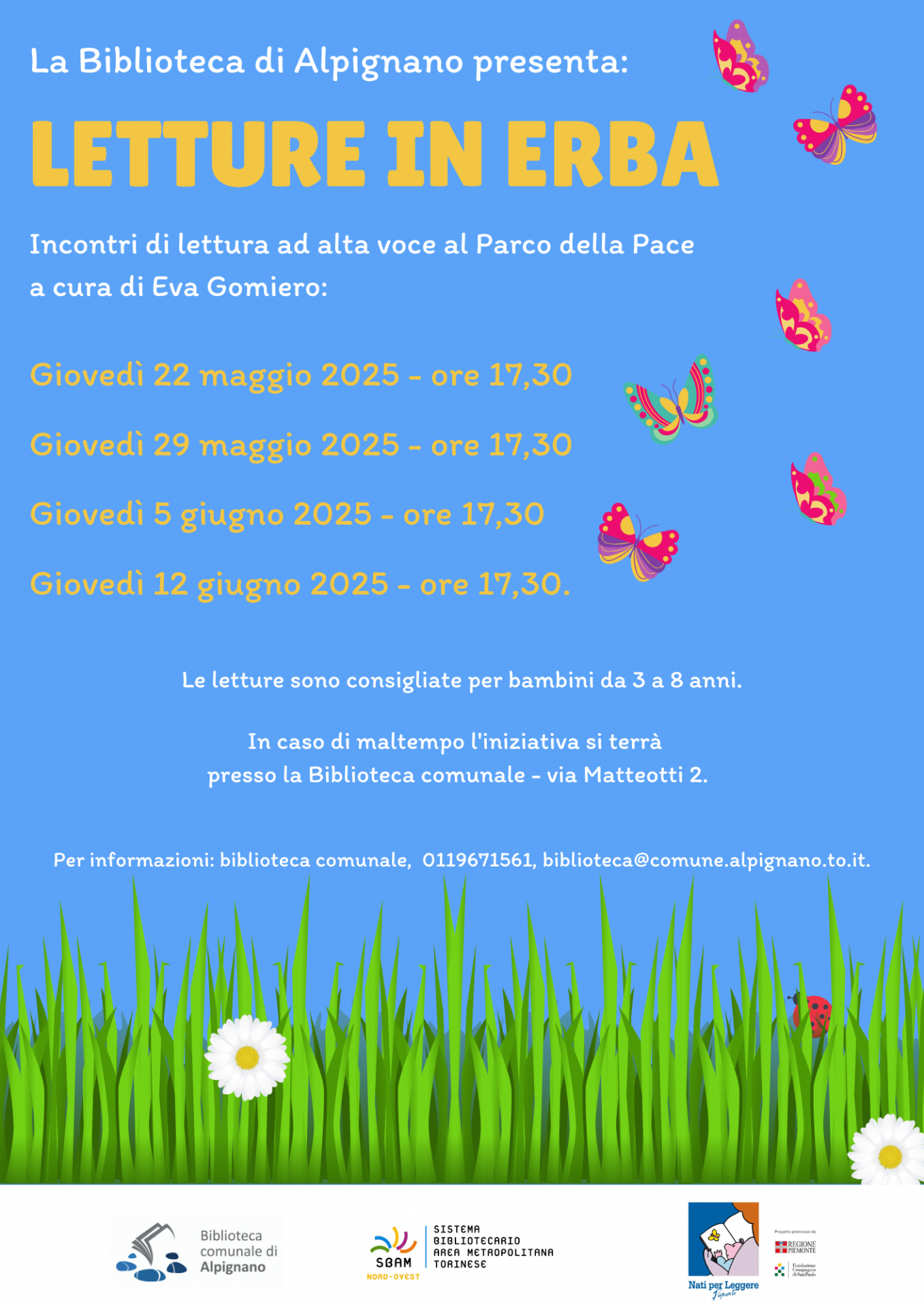 Per informazioni: biblioteca comunale, 0119671561, biblioteca@comune.alpignano.to.it.