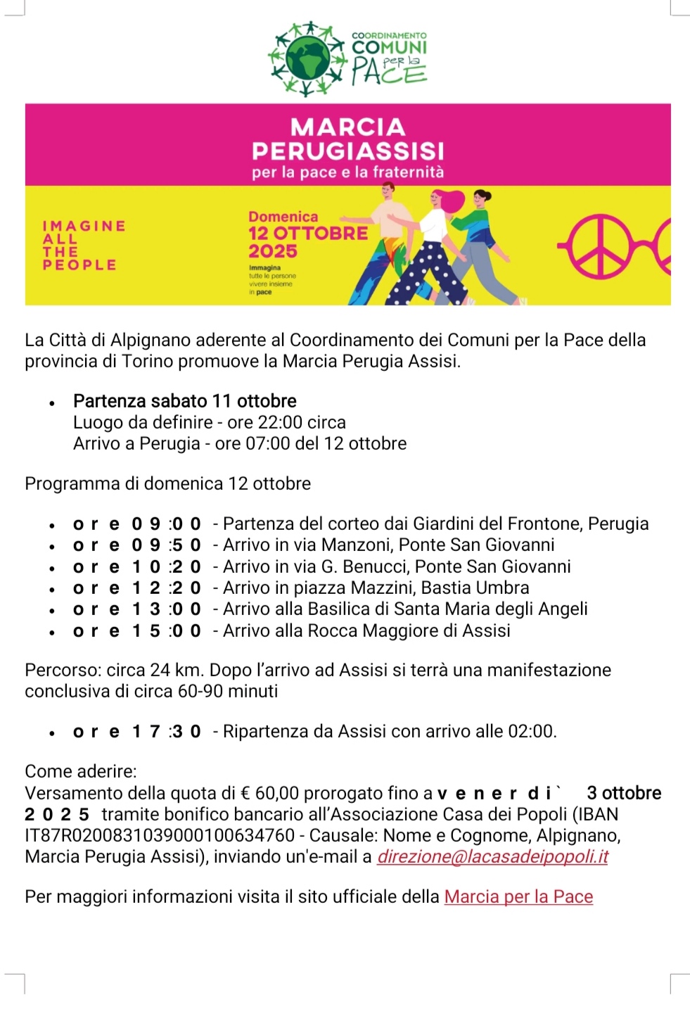 Il Comune di Alpignano facente parte del CoCOPA -Coordinamento Comuni per la Pace- promuove la Marcia per la Pace Perugia-Assisi del 12 ottobre 2025.
