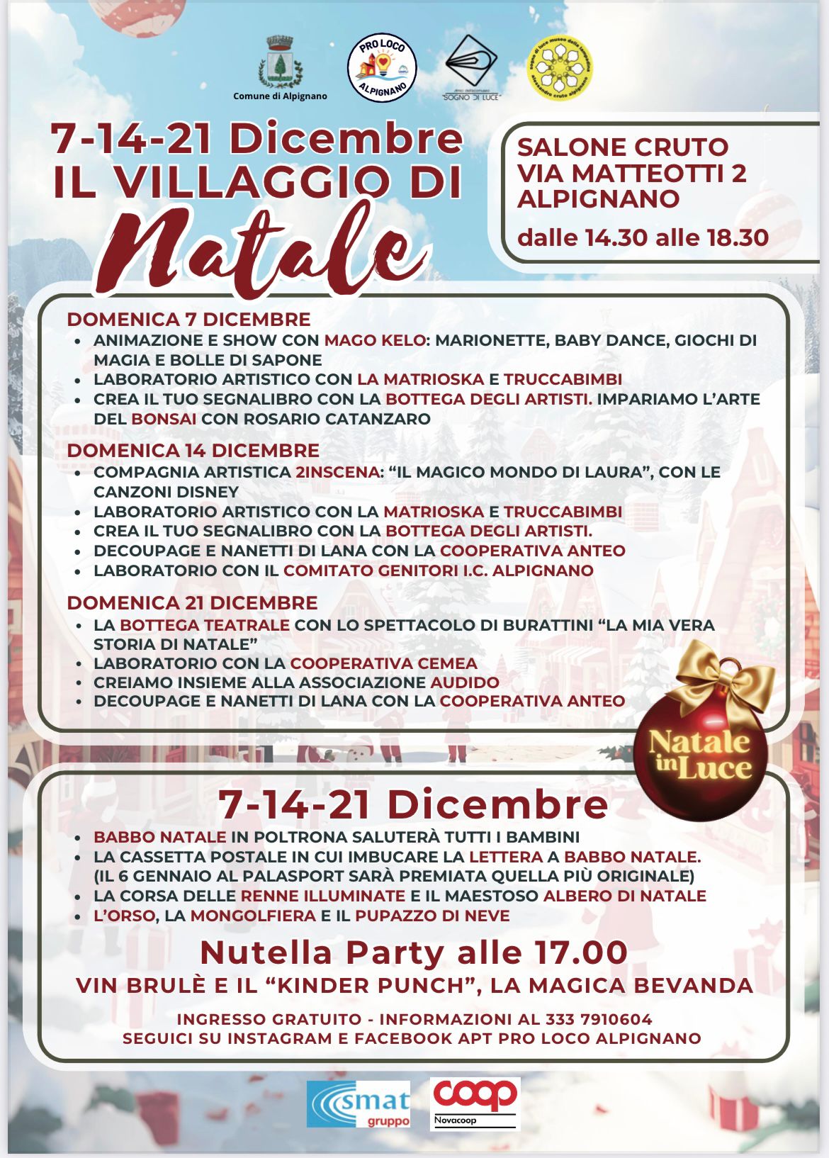 L'Amministrazione comunale è lieta di invitarvi presso il Salone Cruto (via Matteotti 2), dove si svolgerà il Villaggio di Natale, tre pomeriggi dedicati alle famiglie, con spettacoli di animazione, laboratori, giochi e baby dance.