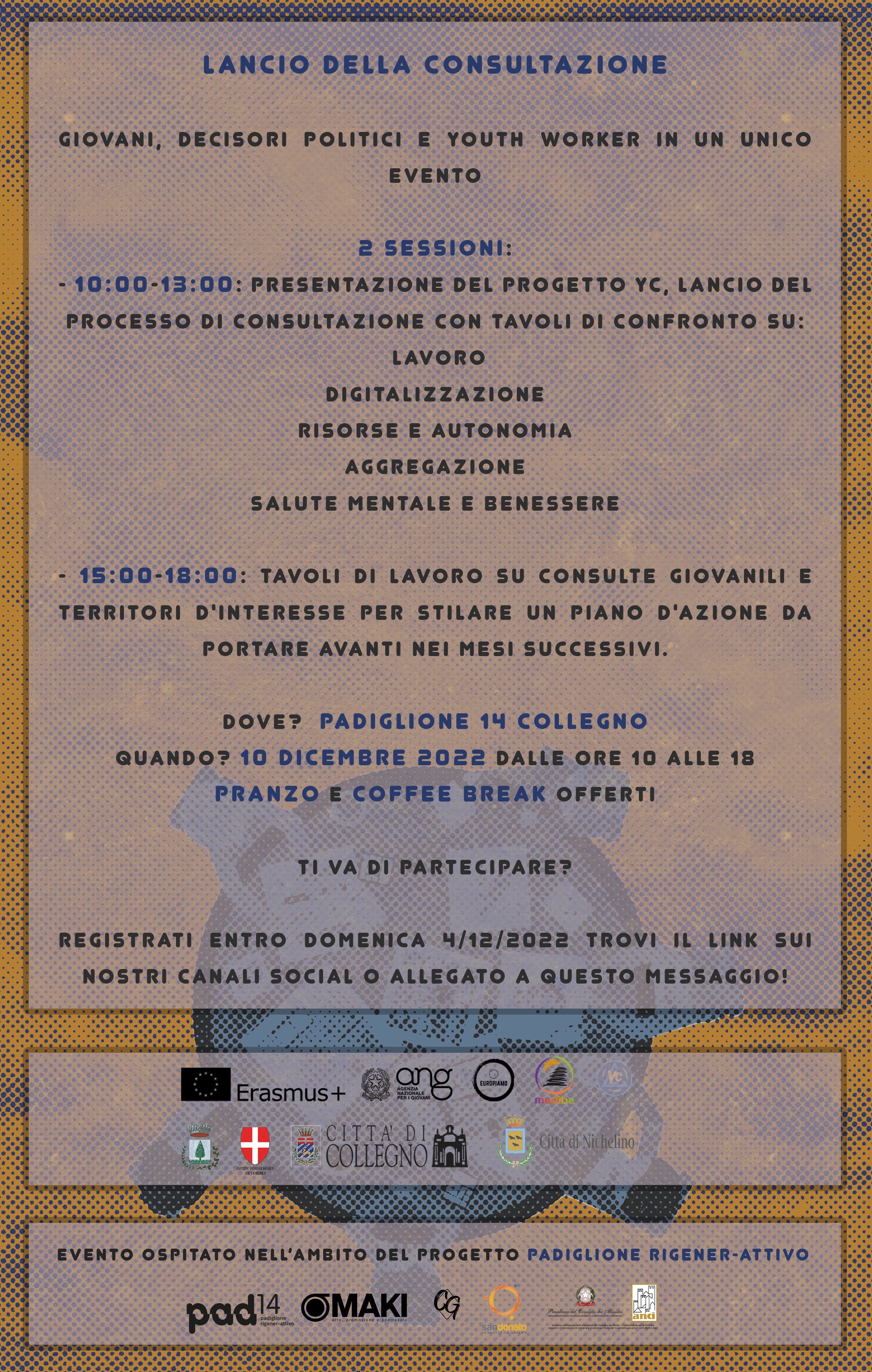 Il 10 dicembre 2022, presso il Padiglione 14 di Collegno, dalle ore 10.00 alle ore 18.00 lanceremo il processo di consultazione pubblica tra giovani, decisori politici e youth workers.