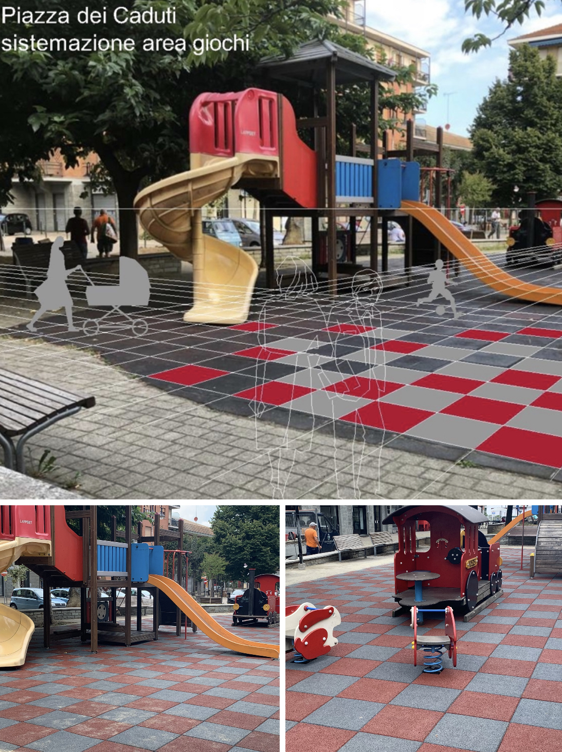 L'Ufficio Tecnico Area Lavori Pubblici informa sono terminati i lavori di posa della pavimentazione dell'area giochi di piazza dei Caduti. La nuova pavimentazione a scacchiera rappresenta un gioco stilistico affascinante grazie all'alternarsi del grigio e del rosso sulla superficie, e potrà essere usata come base del gioco della Dama o degli Scacchi in formato gigante.