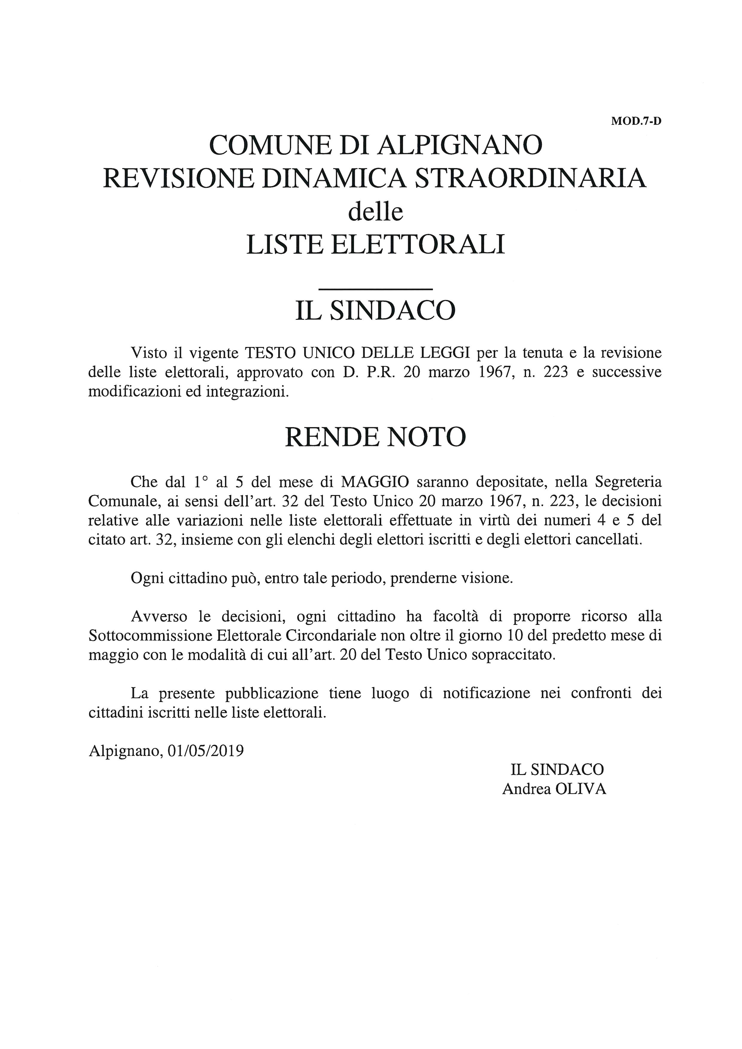 Revione dinamica straordinaria delle listi elettorali dal 1° al 5 maggio 2019 .