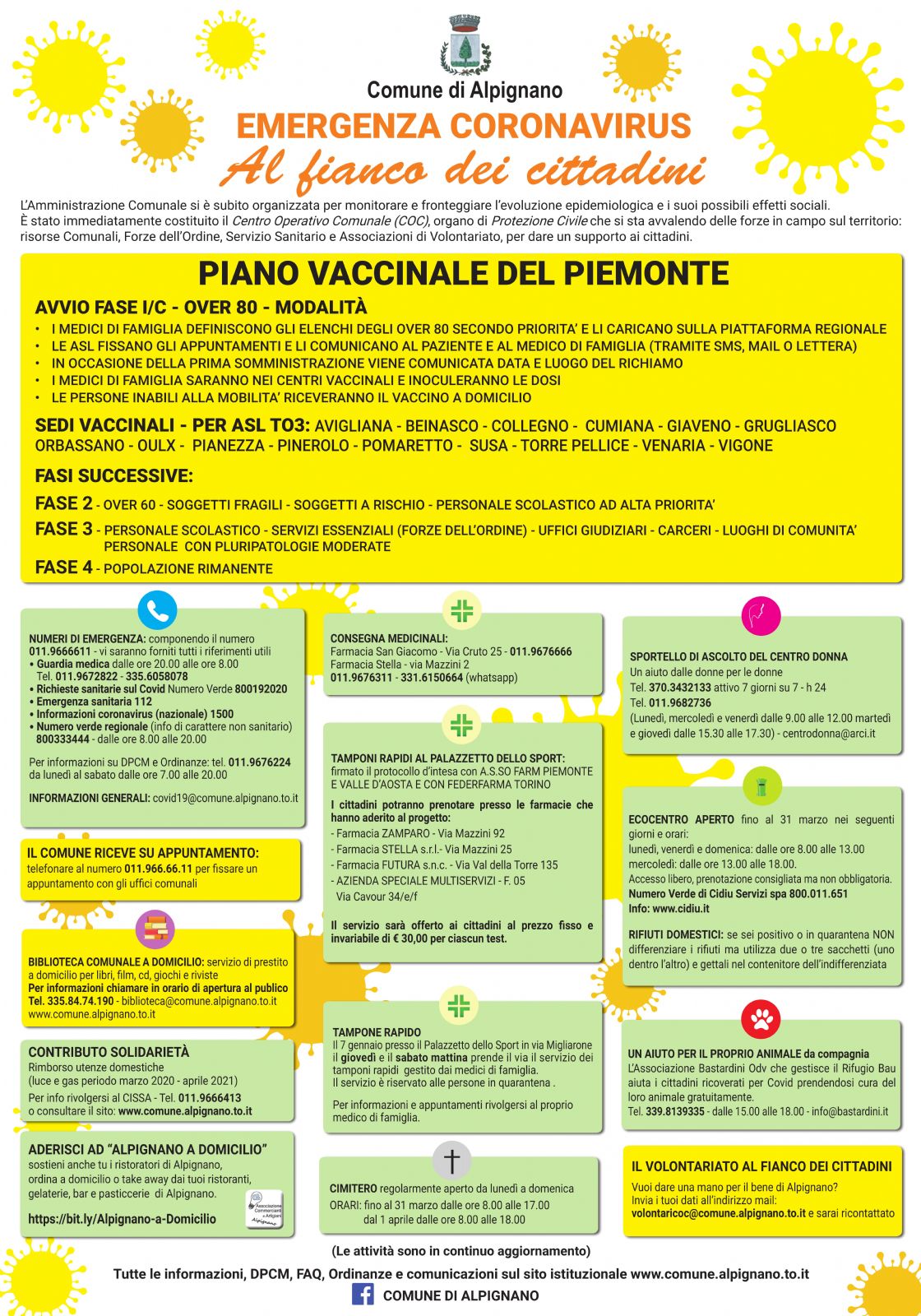 Nel volantino sono elencati i servizi utili per i cittadini aggiornati con il piano vaccinale del Piemonte.
