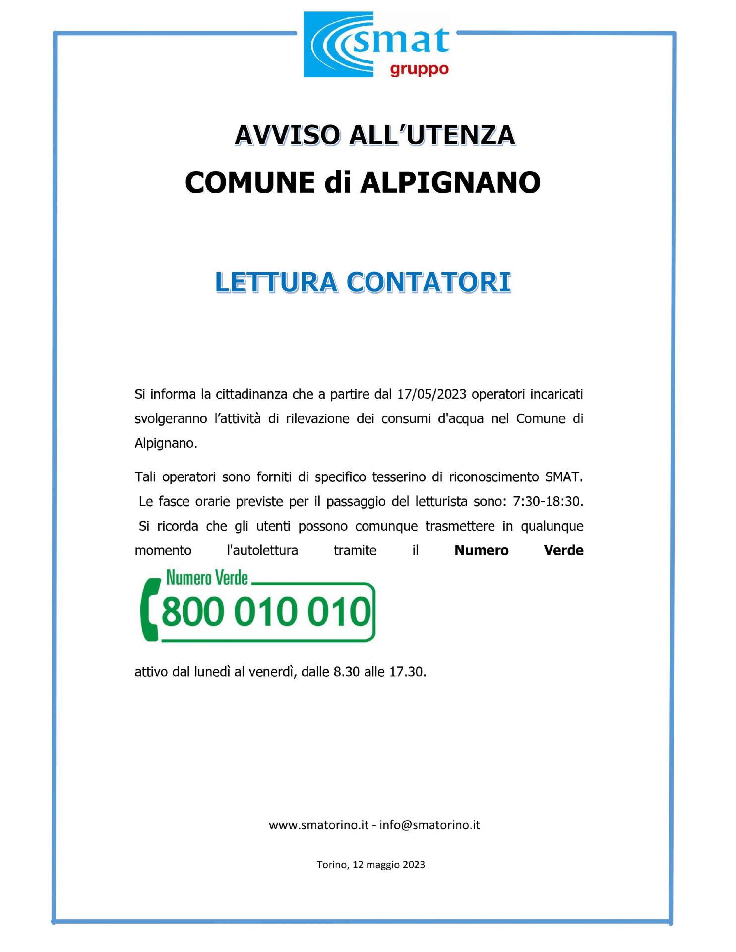 Si informa la cittadinanza che dal 17/05/2023, dalle ore 7:30 e le ore 18:30, operatori incaricati e forniti di tesserino di riconoscimento SMAT svolgeranno l'attività di rilevazione dei consumi d'acqua.