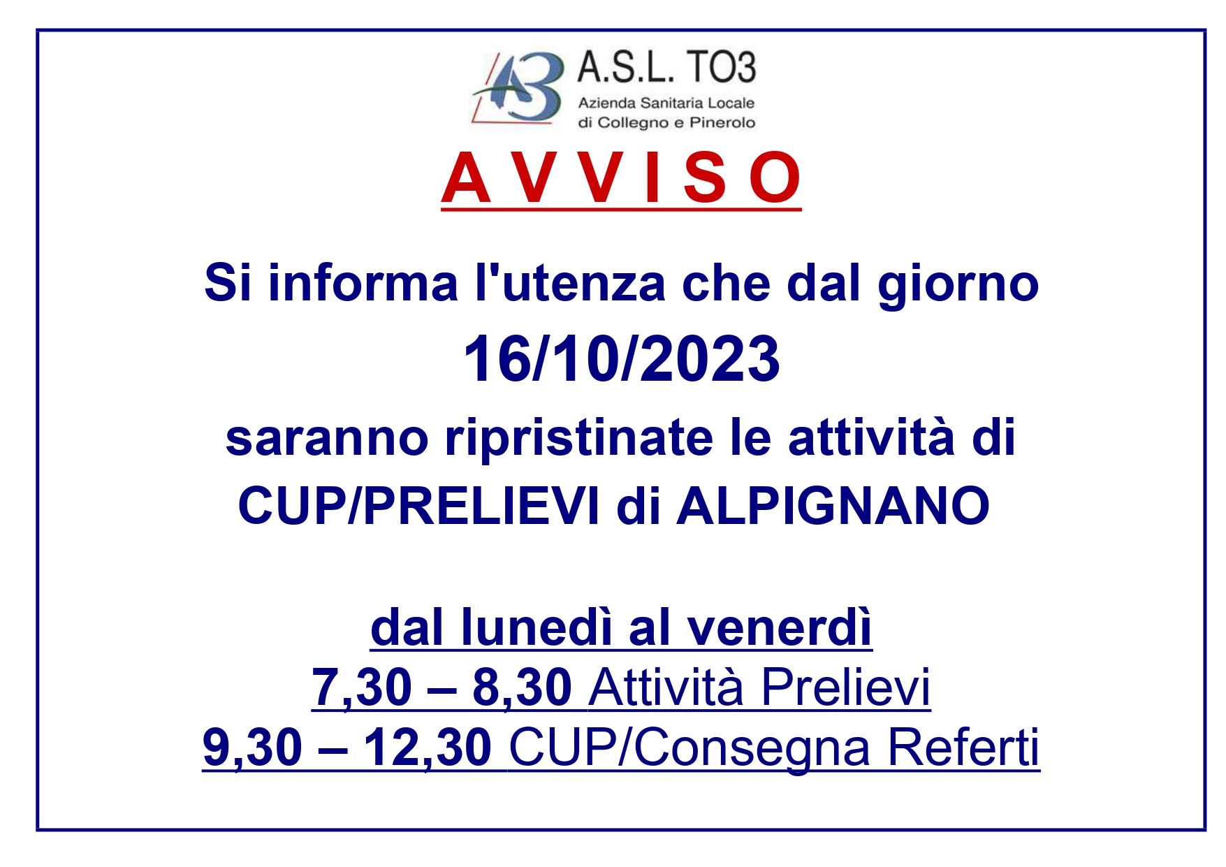 il centro CUP e prelievi torneranno ad avere il normale orario di servizio.