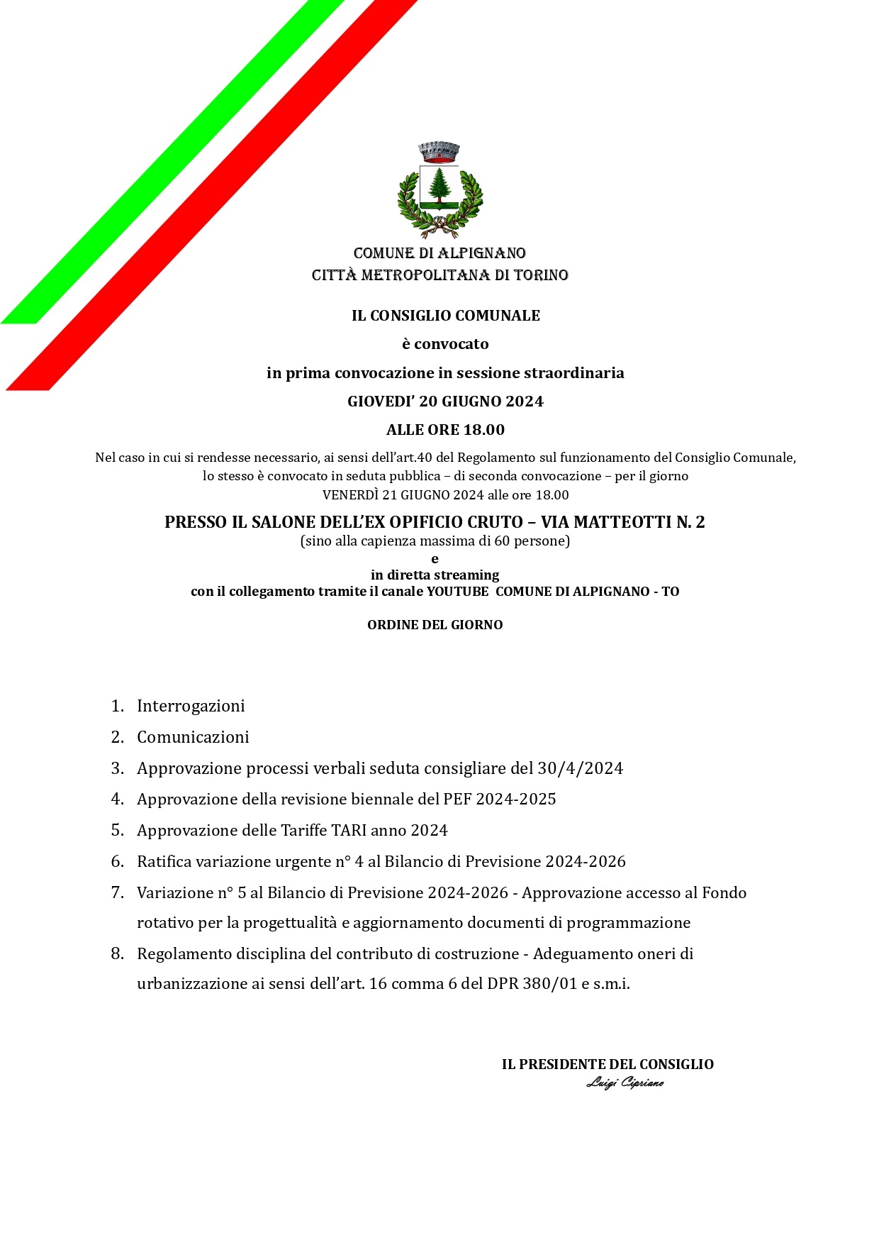 Il Consiglio Comunale è convocato giovedì 20 giugno 2024 ore 18:00 - in 𝐬𝐞𝐜𝐨𝐧𝐝𝐚 𝐜𝐨𝐧𝐯𝐨𝐜𝐚𝐳𝐢𝐨𝐧𝐞 𝐯𝐞𝐧𝐞𝐫𝐝𝐢̀ 𝟐𝟏 𝐠𝐢𝐮𝐠𝐧𝐨 𝟐𝟎𝟐𝟒 𝐚𝐥𝐥𝐞 𝐨𝐫𝐞 𝟏𝟖.𝟎𝟎 - presso il Salone ex Opificio Cruto - via Matteotti 2 (sino alla capienza massima di 60 persone).