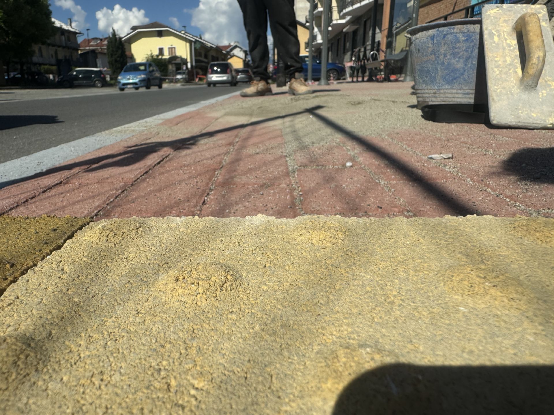 Oggi sono in corso i lavori di posa dei segnali relativi ai percorsi tattili nelle nuove fermate dell'autobus in via Cavour.