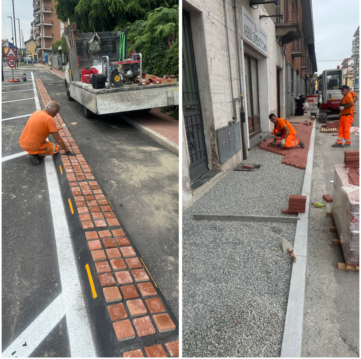 - posa degli autobloccanti per il nuovo marciapiede (PEBA) di via Cavour lato destro nel tratto compreso tra via Primo Maggio e via Mussino;