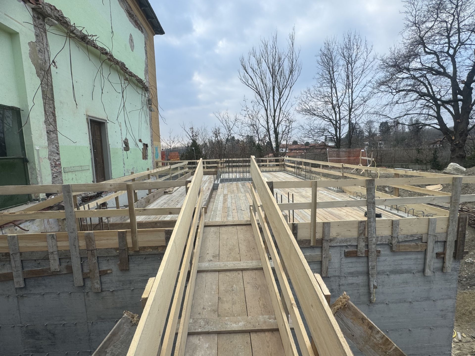 Oggi sono in corso i lavori per la realizzazione della carpenteria della trave ribassata del solaio a sbalzo del piano terreno del nuovo blocco servizi della villa storica.