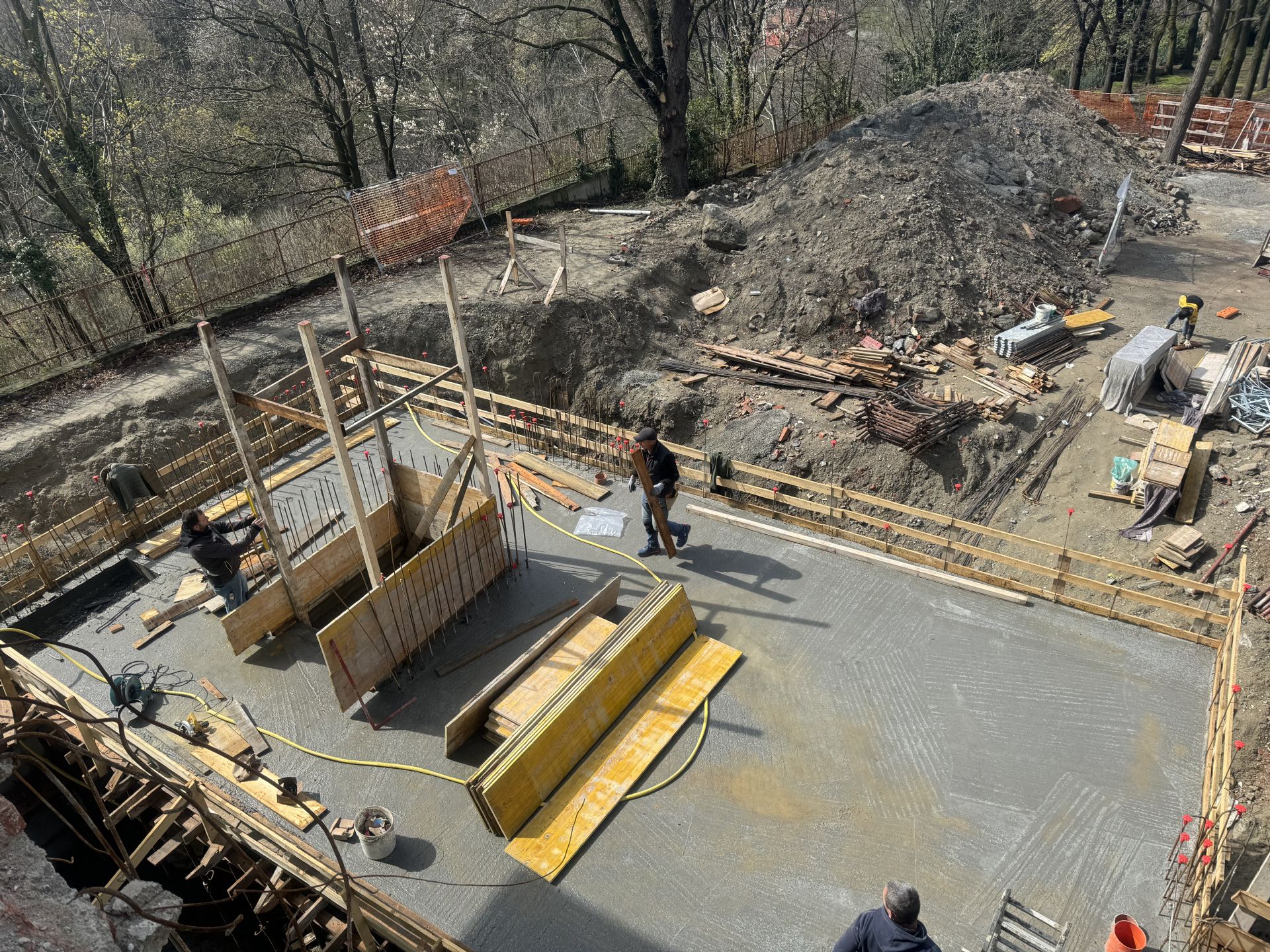 Oggi sono in corso i lavori per la realizzazione della carpenteria dei setti e del vano ascensore in cemento armato dalla quota del solaio del piano terra al solaio del piano primo. Tale lavorazione è funzionale per la realizzazione del nuovo blocco servizi della villa storica.