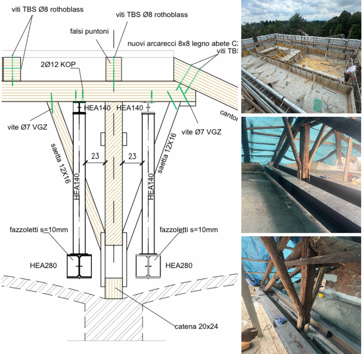 - posa delle due putrelle in acciaio HEA280 per la realizzazione del cavalletto metallico finalizzato al miglioramento statico locale della trave di colmo della struttura lignea della copertura.