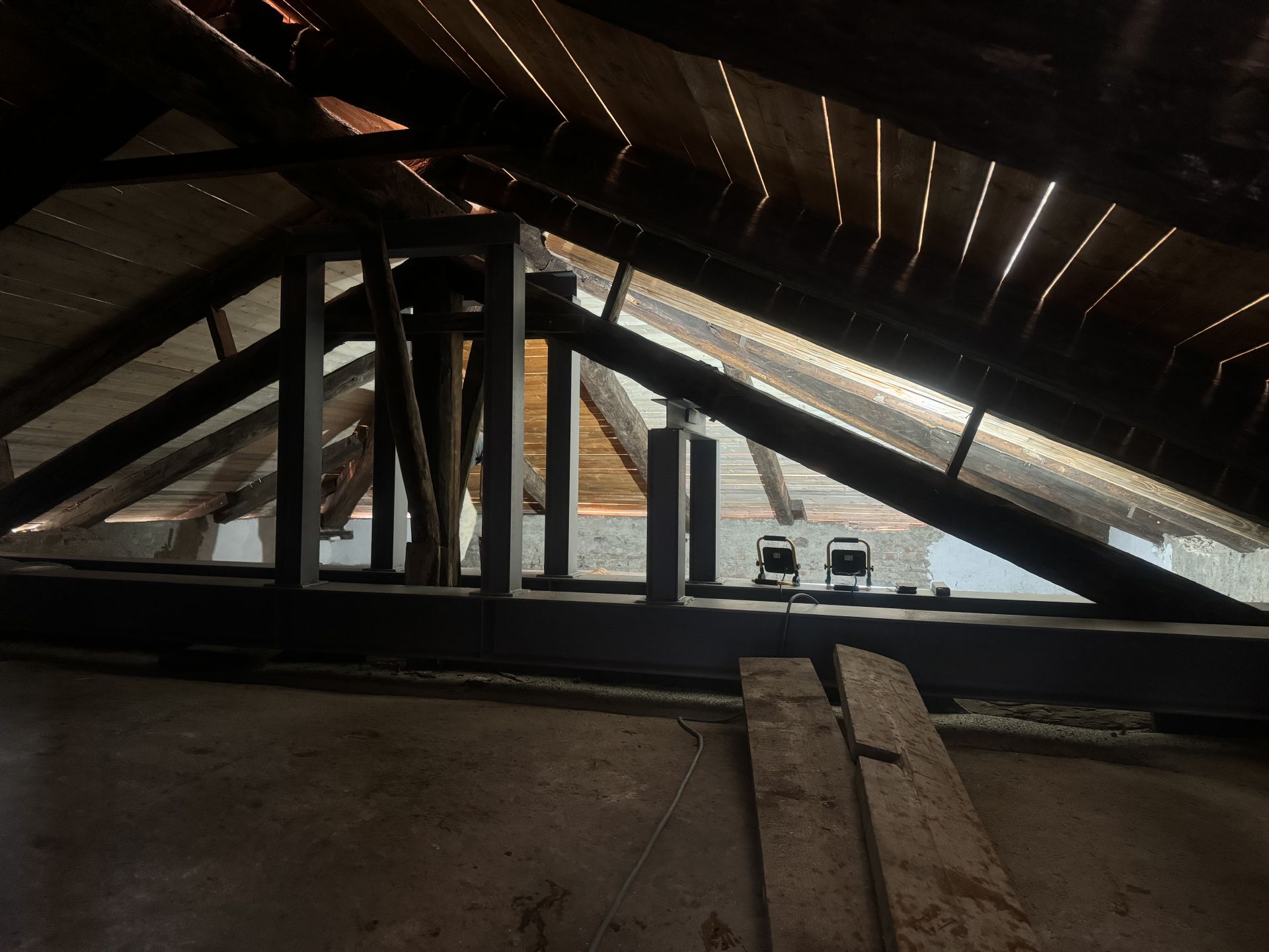 Oggi sono in corso i lavori di trattamento con vernice antitarlo del tavolato ligneo lato interno della copertura.
