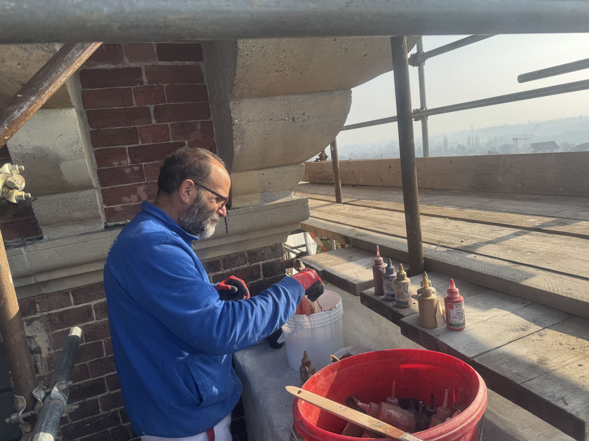 Oggi sono in corso i lavori di restauro dei muri e delle mensole esterne della torre della villa storica.