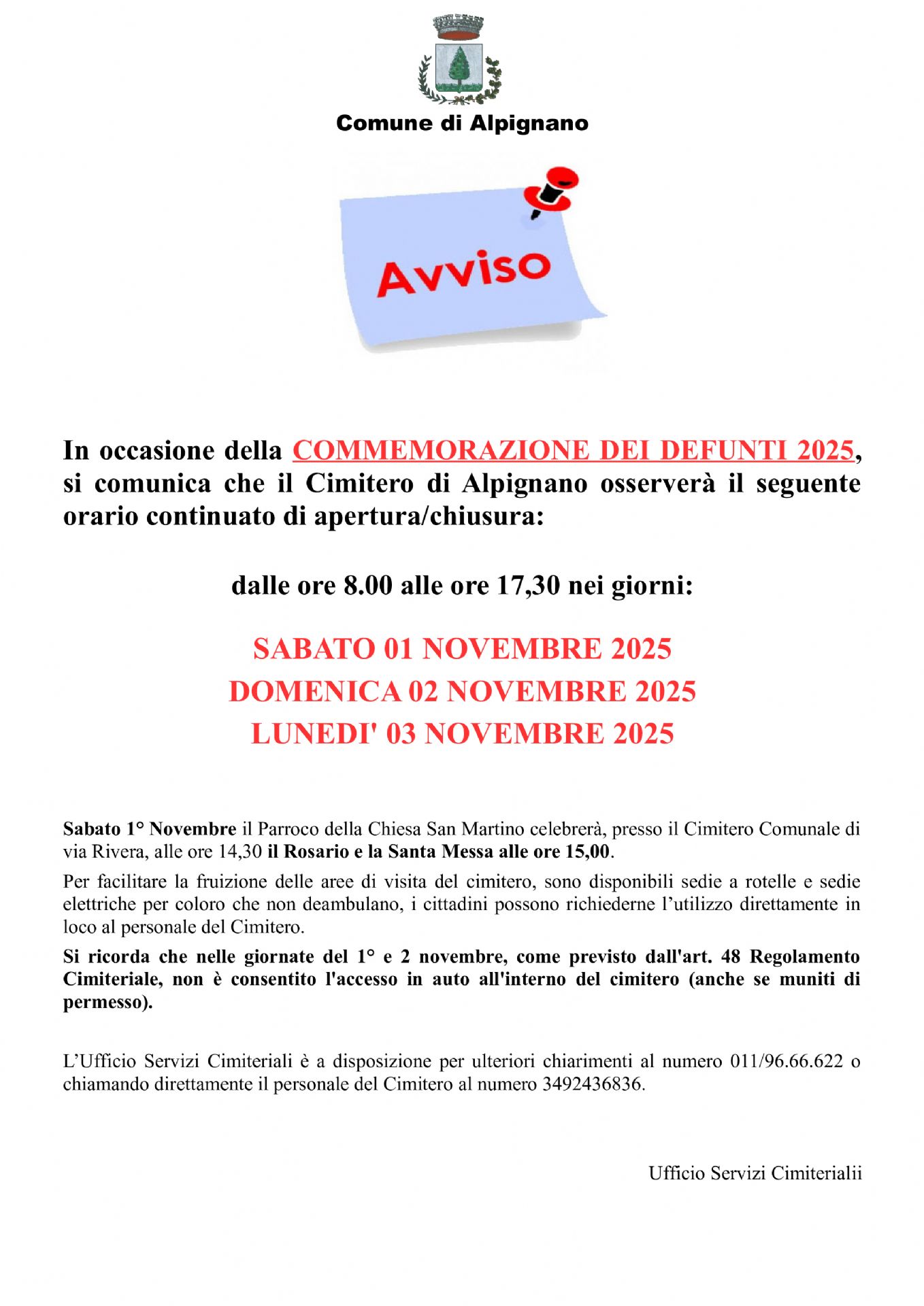 Apertura straordinaria cimitero in occasione della Commemorazione dei Defunti