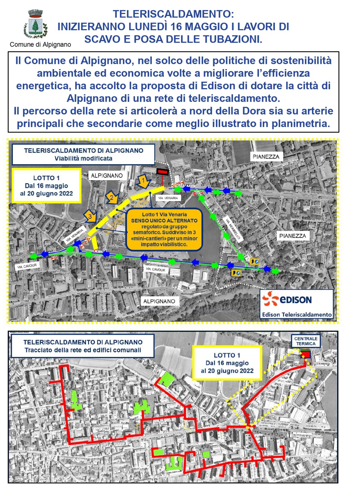 Il Comune di Alpignano, nel solco delle politiche di sostenibilità ambientale ed economica volte a migliorare l’efficienza energetica, ha accolto la proposta di Edison di dotare la città di Alpignano di una rete di teleriscaldamento.