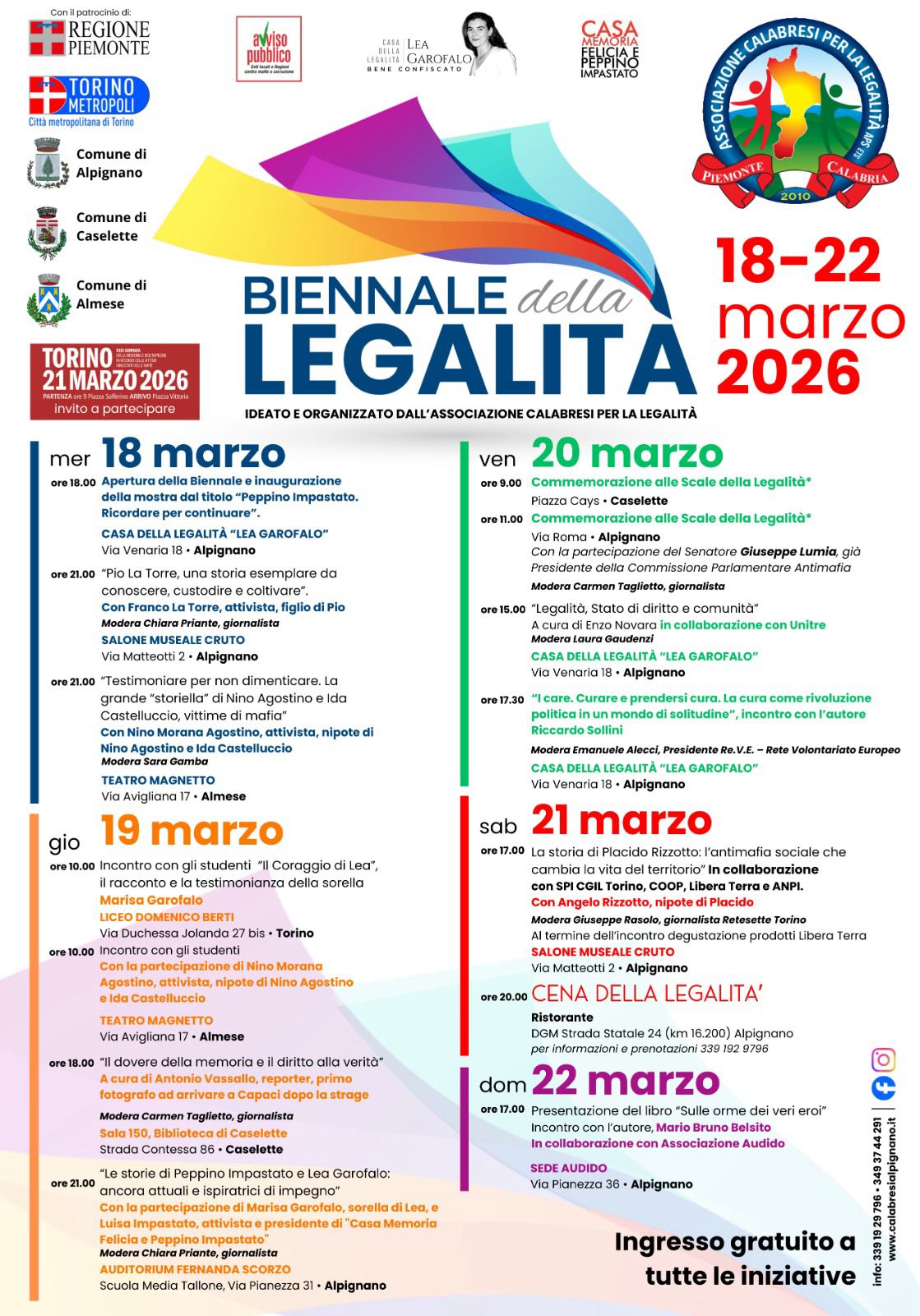 L'Associazione Calabresi per la Legalità organizza nelle giornate dal 18 al 22 marzo c.a. la seconda edizione della BIENNALE DELLA LEGALITÀ, cinque giorni di incontri itineranti che coinvolgeranno scuole, associazioni e cittadini dei Comuni di Alpignano, Caselette e Almese sulle vittime innocenti della mafia, per la promozione dei valori di giustizia e legalità che caratterizzano l'attività dell'associazione.