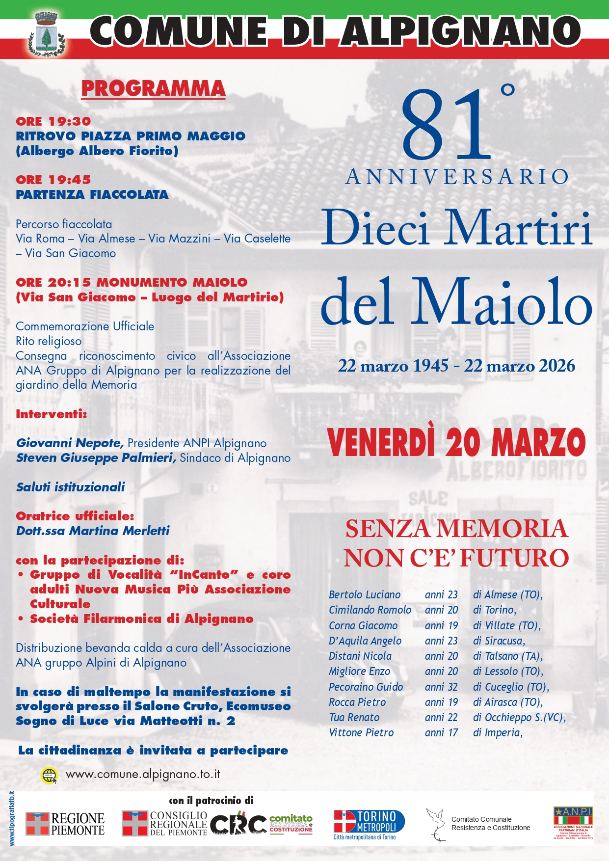 Alle 20:15 presso il Monumento dedicato ai Martiri, in via San Giacomo ci sarà la Commemorazione Ufficiale.