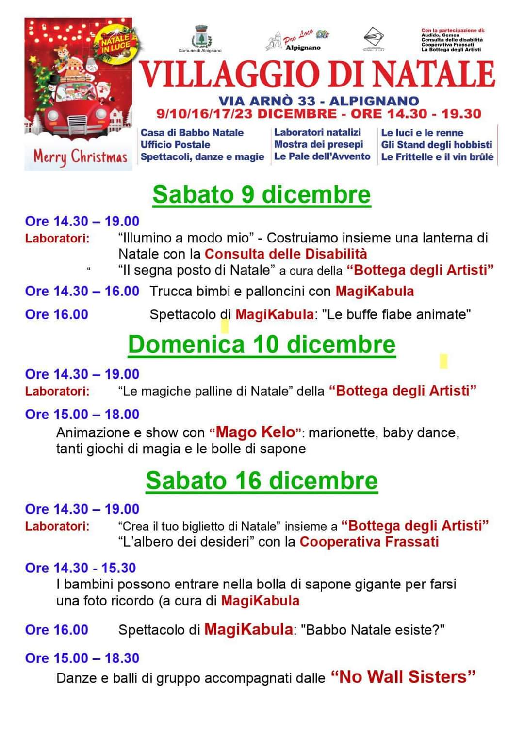 E poi il "Villaggio di Natale", allestito in via Arnò 33, con laboratori e spettacoli tutti i pomeriggi nei giorni 9, 10, 16, 17 e 23 dicembre.