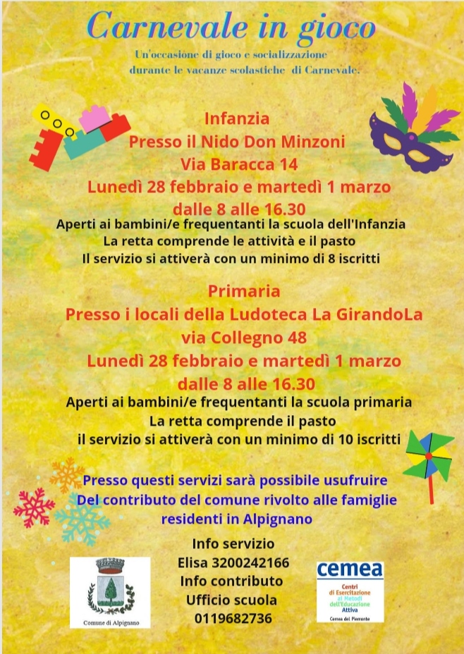 Un'occasione di gioco e socializzazione durante le vacanze scolastiche di Carnevale, aperto ai bambini della scuola dell'Infanzia e della scuola Primaria.