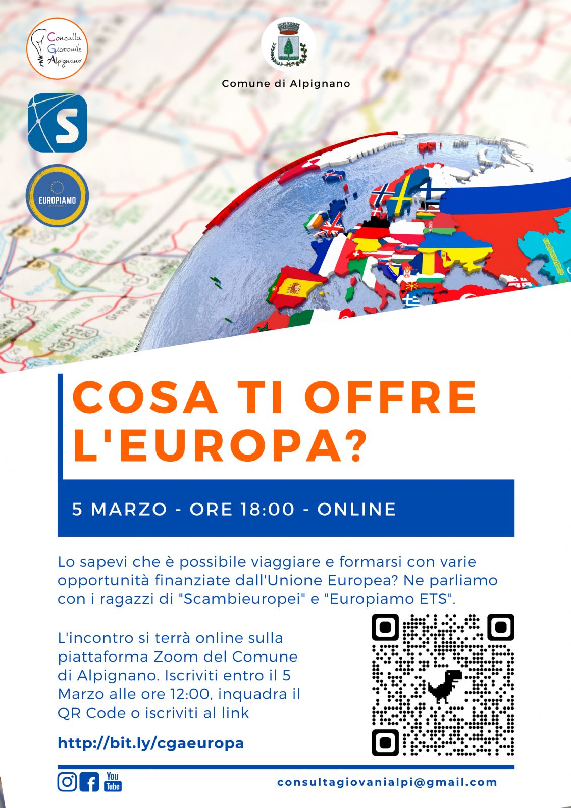 Lo sapevi che è possibile viaggiare e formarsi con varie opportunità finanziate dall'Unione Europea? Ne parliamo con i ragazzi di "Scambieuropei" e "Europiamo ETS" venerdì 5 marzo 2021 in un evento zoom pensato per i giovani di Alpignano.