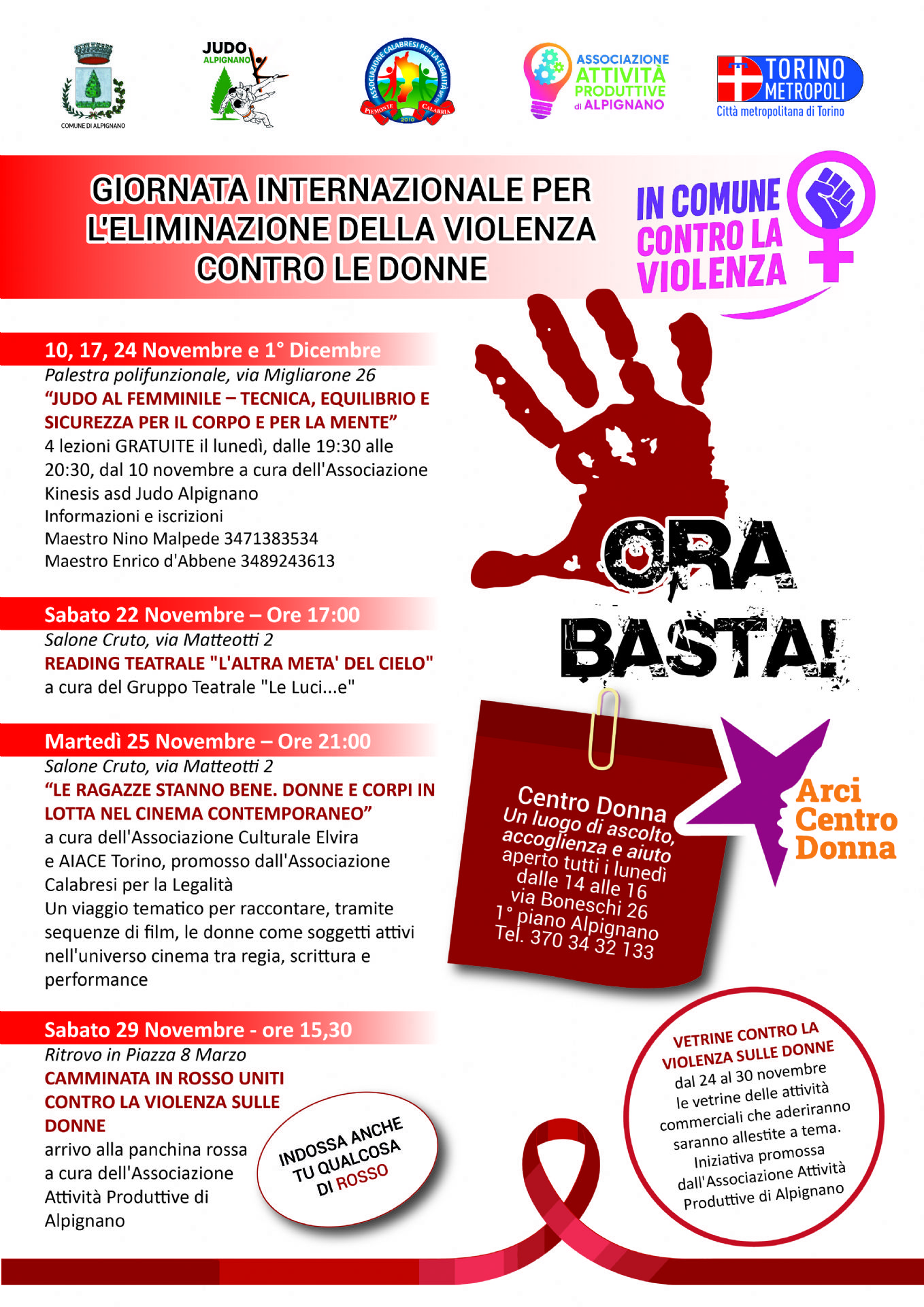 Il 25 novembre ricorre la Giornata internazionale per l’eliminazione della violenza contro le donne, istituita dall’Assemblea generale delle Nazioni Unite con risoluzione n. 54/135 del 17/12/1999. L' Amministrazione comunale, con il patrocinio di Città Metropolitana di Torino e la collaborazione delle associazioni Calabresi per la Legalità, Kinesis Judo Alpignano e Attività Produttive di Alpignano, promuove iniziative di sensibilizzazione. Ecco quali.