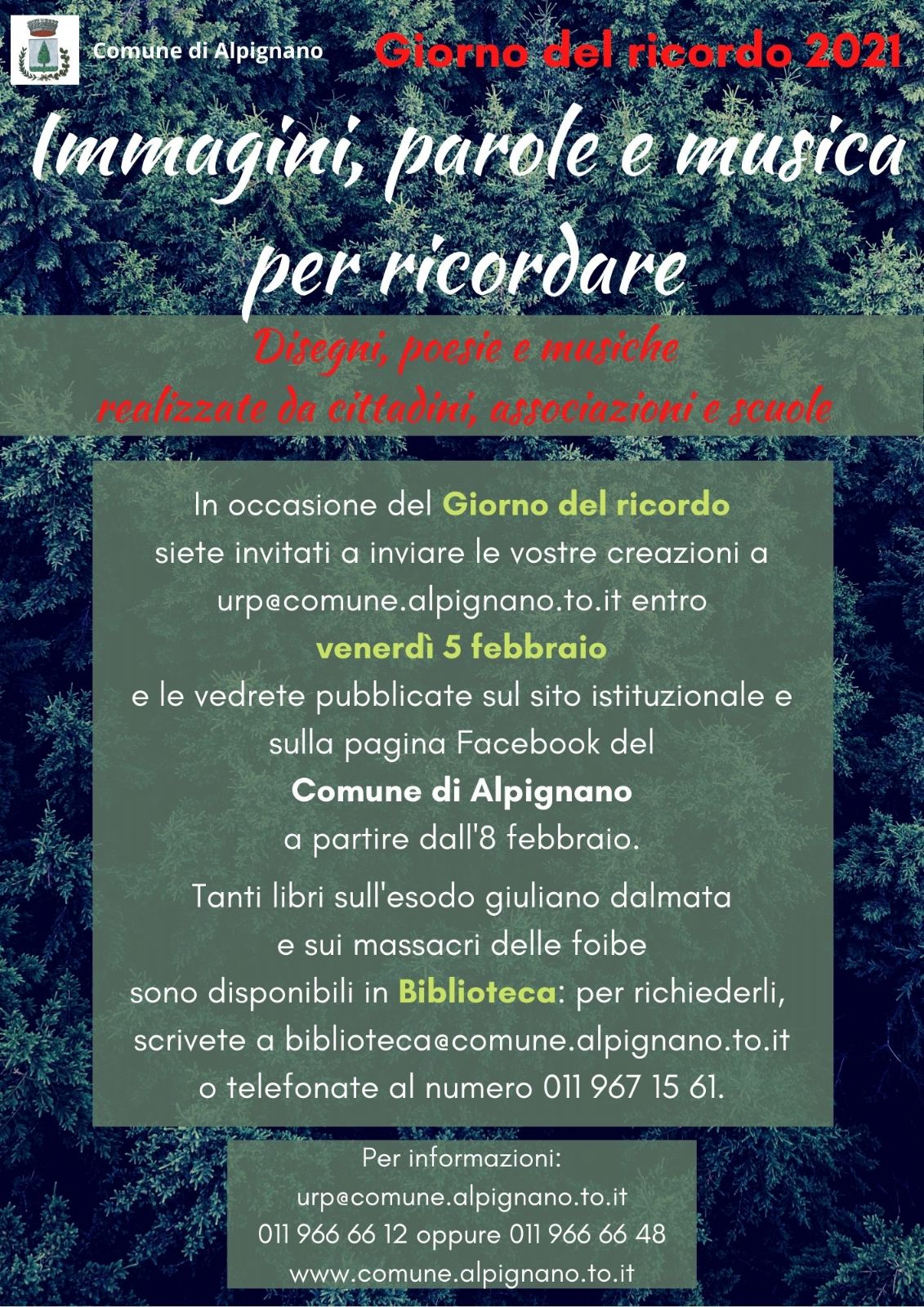 Per il Giorno del Ricordo, giornata nazionale che si celebra il 10 febbraio di ogni anno in ricordo del massacro delle foibe e dell'esodo giuliano dalmata, cittadini, associazioni e scuole possono inviare disegni, poesie e musiche che rappresentino il Giorno del Ricordo.