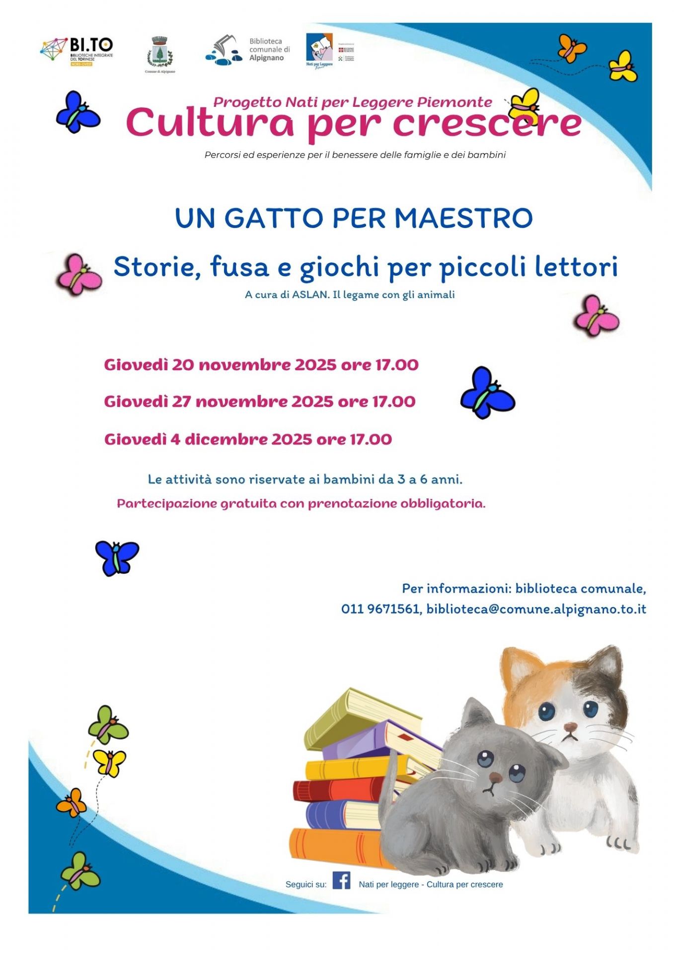 In occasione della Settimana nazionale Nati per leggere, la biblioteca organizza incontri di lettura in compagnia di un gatto, destinati a bambini da 3 a 6 anni.