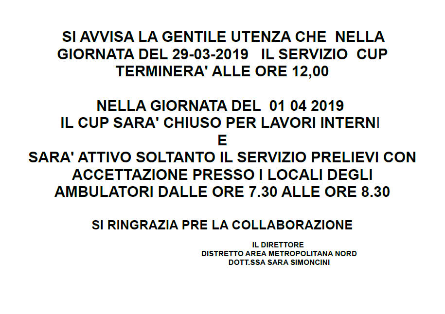 Chiusura CUP ASL - Via Philips nelle giornate del 29.03.2019 (dalle ore 12.00) e del 01.04.2019 (tutto il giorno)