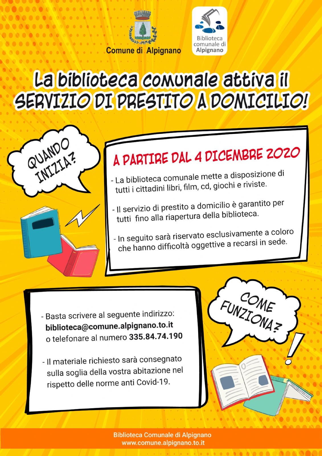 Basta scrivere al seguente indirizzo: biblioteca@comune.alpignano.to.it o telefonare al numero 335.84.74.190