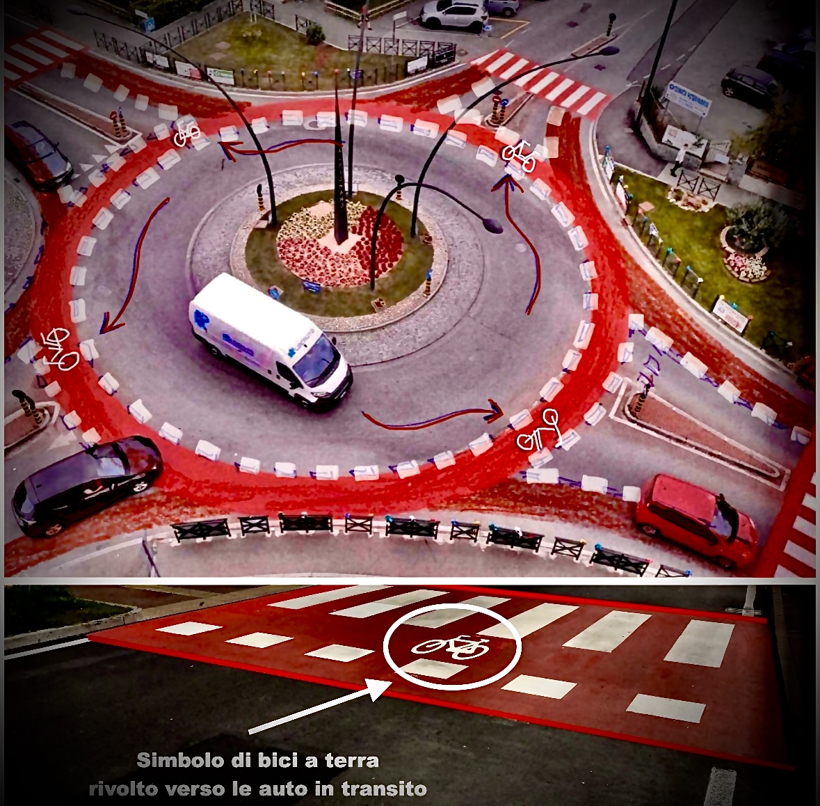 Verranno inoltre disegnati dei simboli di bici a terra rivolti verso le automobili in transito che usciranno dalla rotatoria.