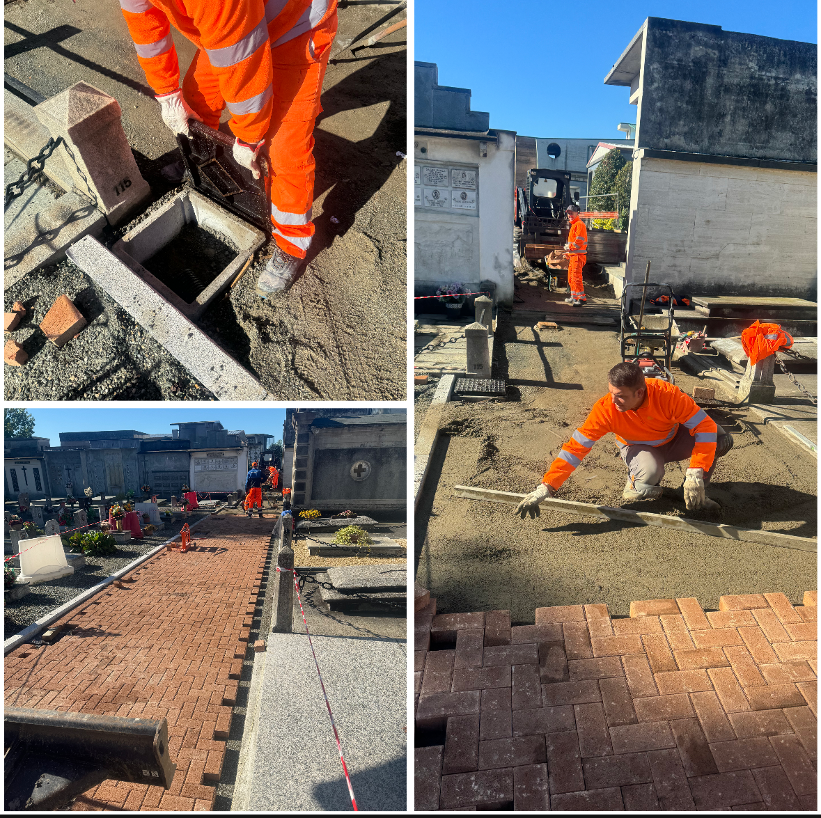 Continuano i lavori di sistemazione dei vialetti all'interno del cimitero comunale con l'eliminazione delle barriere architettoniche (PEBA) e la realizzazione di cavidotti a servizio delle infrastrutture.
