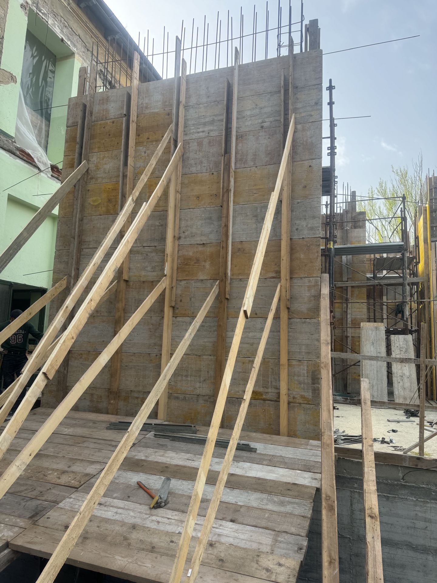 Oggi sono in corso i lavori per il completamento della carpenteria dei setti in cemento armato dalla quota del solaio del piano terra al solaio del piano primo. Tale lavorazione è funzionale per la realizzazione del nuovo blocco servizi della villa storica.